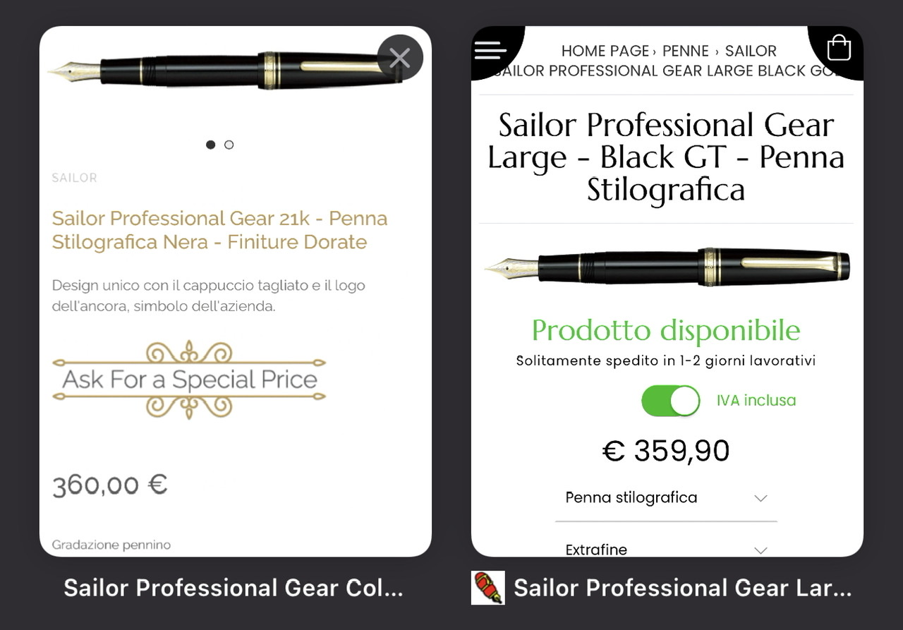 Le Sailor con pennino bicolore sono bellissime (anche una Montblanc non mi dispiacerebbe eventualmente, anche se mi sa di più commerciale/pop/di moda) e vorrei cercare di capire che differenza c’è tra la pro gear e la 1911 large (la professional gear large non esiste, mi pare di capire…). Le vedo assolutamente identiche, anche come prezzo, ma se una fosse più grande la preferirei. Ho cercato informazioni sul sito Sailor, ma non è che ci abbia capito granché… Come tratto, ho tutte F. Ho sempre paura che EF si faccia sentire troppo sulla carta come mi è successo con la Pelikan e con la Preppy, ma mi piacerebbe un EF. Tratti più grossi non ne voglio sapere. Scrivo troppo piccolo per arrischiarmi su un M o un B. Fatico parecchio a scrivere in modo normale (quindi piccolo) e leggibile con lo stub 1,1 Lamy, che almeno in metà dei tratti è molto fine.