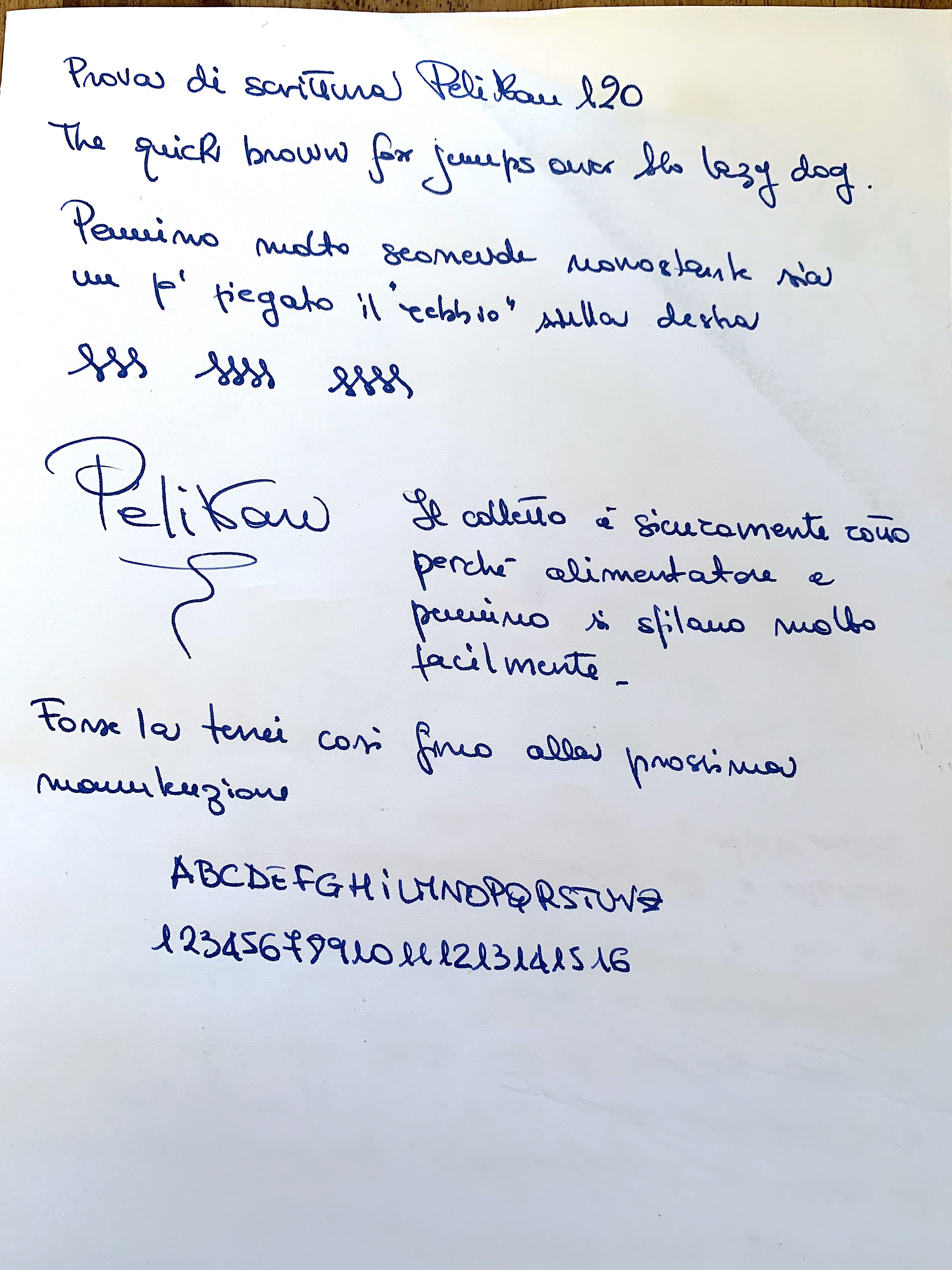 Vi metto anche la prova di scrittura e una foto del pennino (fatta con il cellulare), sperando si percepisca dove è leggermente piegato, così mi dite cosa ne pensate.