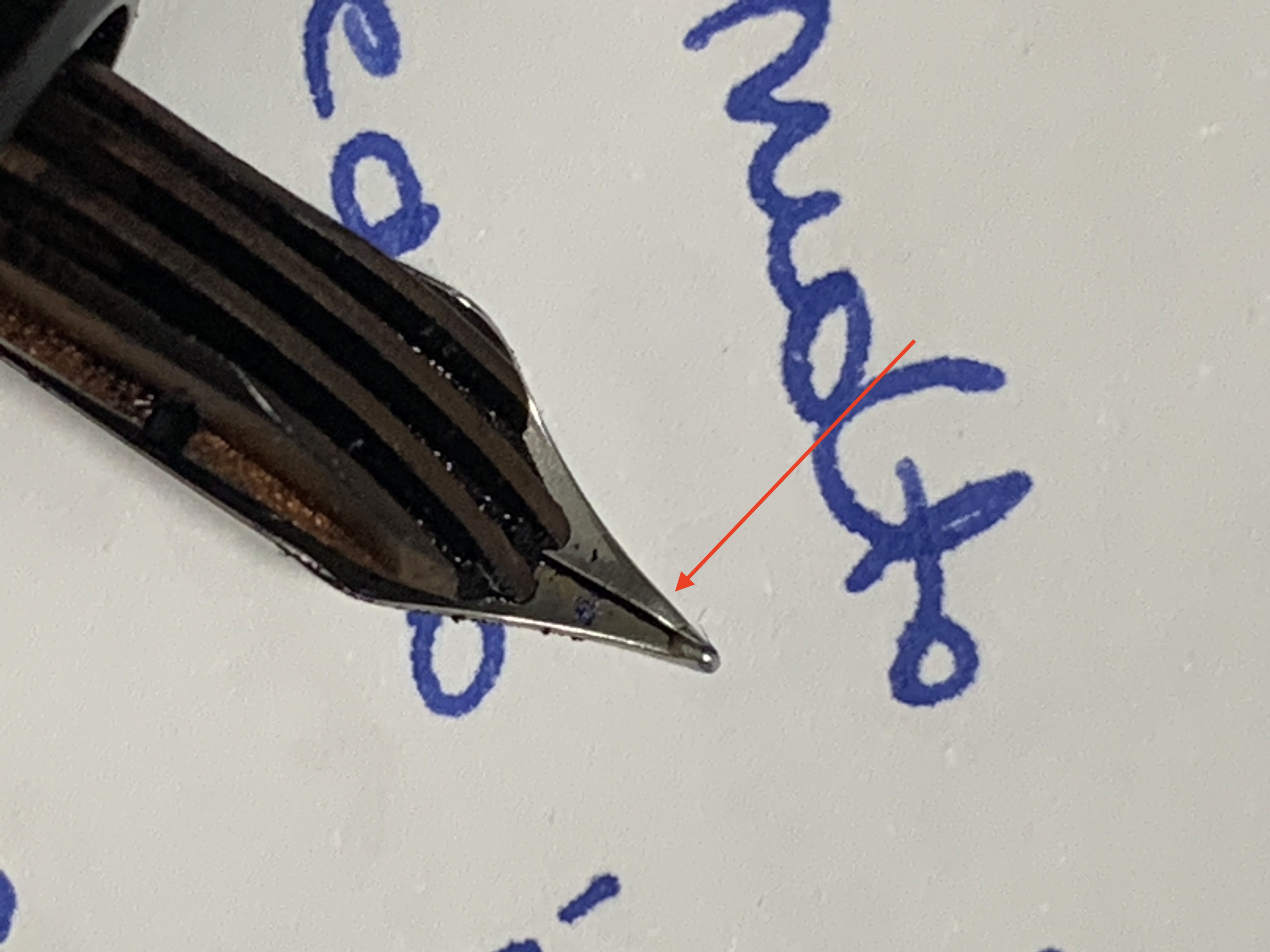 Il feedback è stranamente molto buono, nonostante uno dei due rebbi, quello di destra, sia leggermente piegato subito sopra la punta e quindi disallineato. Insomma la penna scrive incredibilmente bene, senza salti e senza grattare nonostante tutto, soprattutto se scrivendo ci si trova ad assecondare la piegatura del pennino.