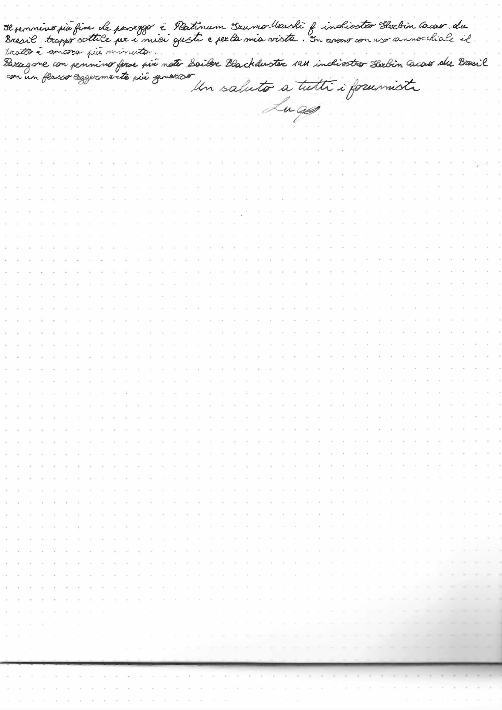 allego scarabocchio eseguito con il mio pennino più fine ovvero un f Platinum comparato con un Sailor sempre f. L'inchiostro è un Herbin Cacao che trovo piuttosto fluido e carta Rhodia; credo che per avere dei riscontri più precisi, essendo elementi incisivi, dovremmo utilizzare la medesima carta ed il medesimo inchiostro.
