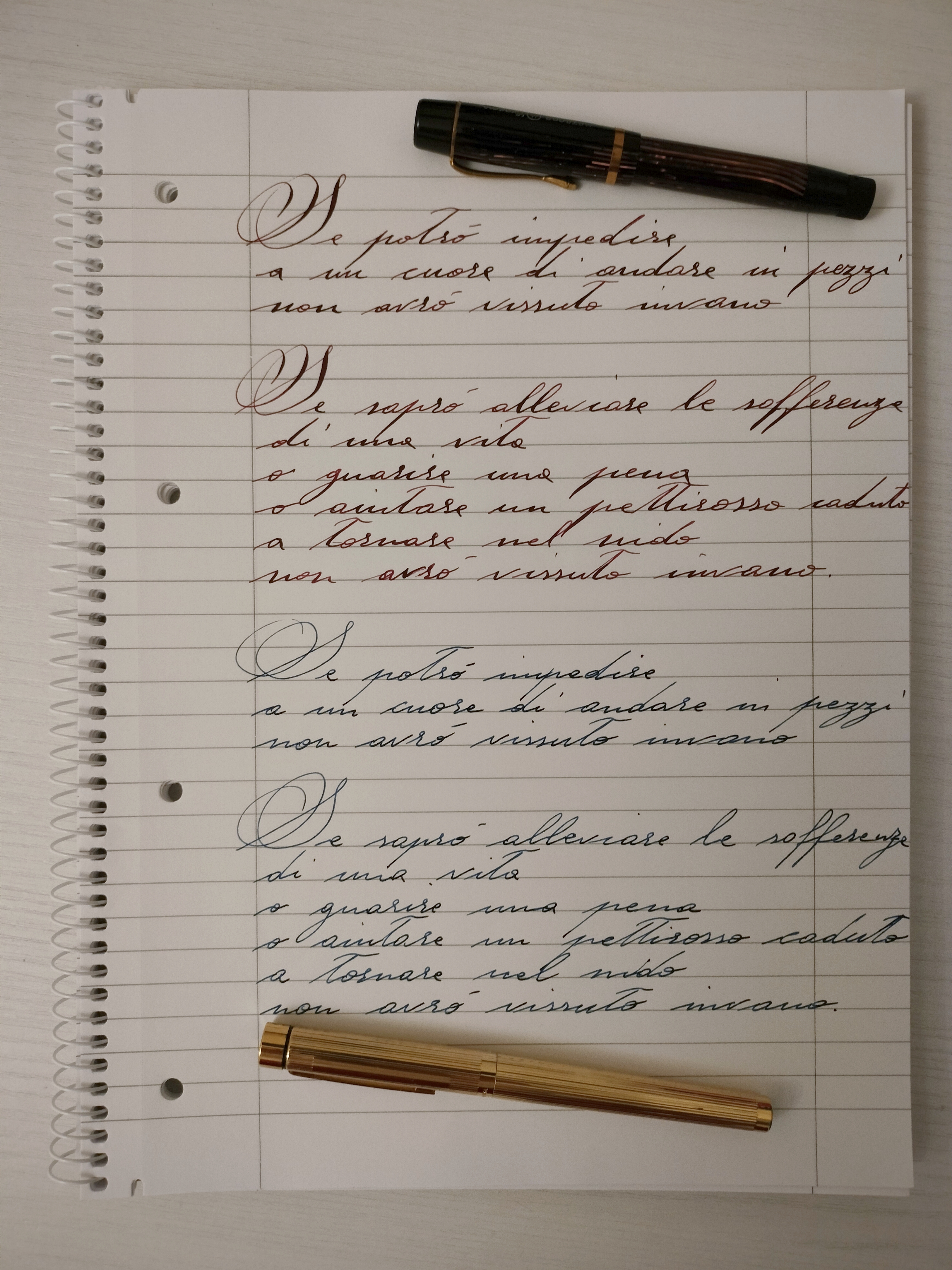 Nella parte alta ho scritto con una Matador flessibile (pennino bellissimo ma non facile da usare) e nella parte bassa con una Sheaffer Targa pennino fine molto scorrevole.
