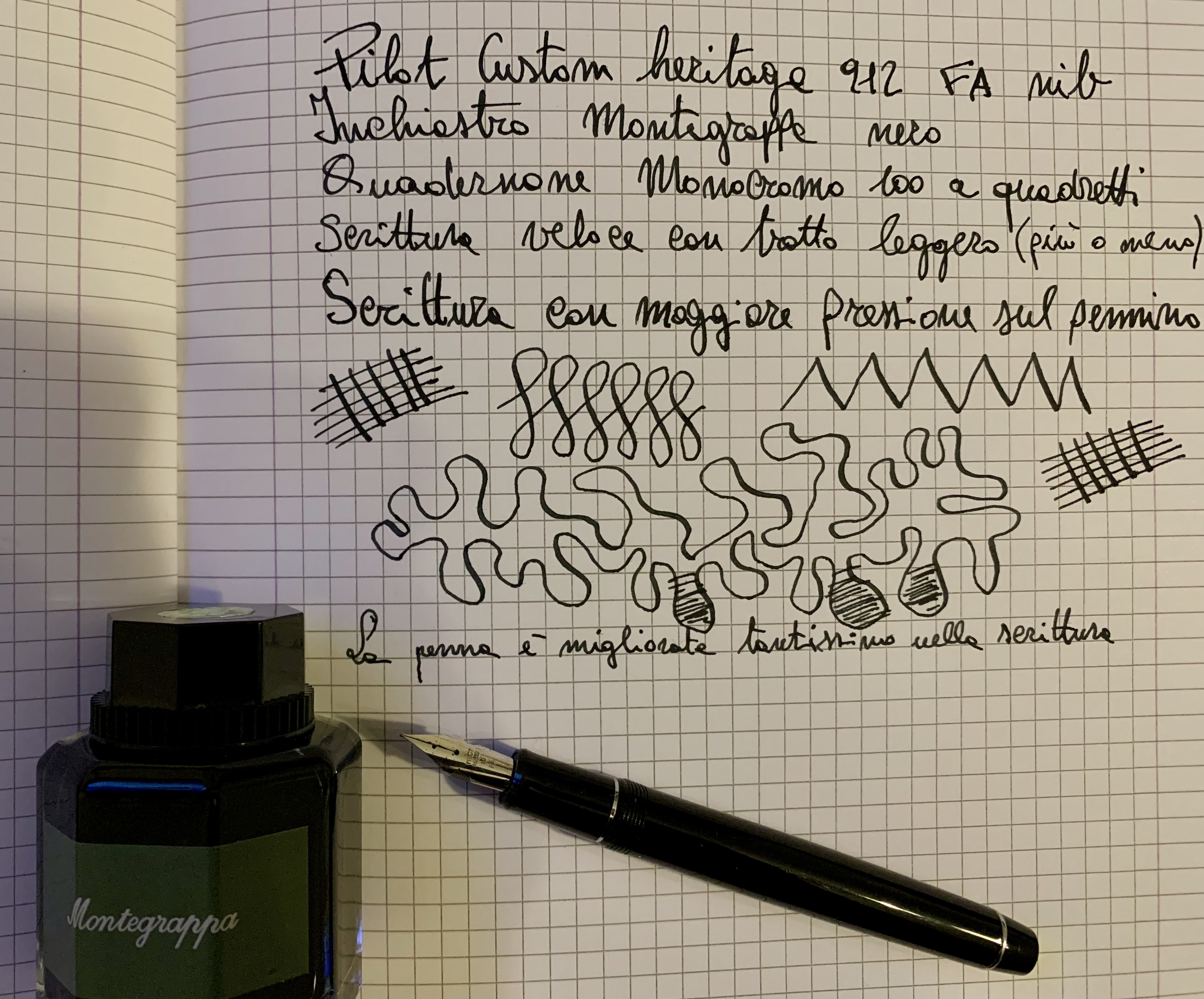 ho controllato i rebbi con la lente, sembrano essere correttamente allineati. ho ordinato l'inchiostro Noodler’s POLAR Black, scegliendo tra i vari consigliati. nel frattempo, ho caricato la penna con l'inchiostro nero Montegrappa che avevo nel cassetto della scrivania. la penna ha fatto un salto di qualità! non sono in grado di spiegare nel dettaglio, per cui allego una foto. il flusso è quasi costante. il pennino gratta molto meno e solo nei tratti ascendenti. non schizza più inchiostro. ho fatto qualche scarabocchio in velocità con pressioni variabili, per stressare la penna. ha reagito abbastanza bene. devo imparare ad usare meglio la penna: esercitare meno pressione sul pennino quando ricerco il tratto fine, variarla nei momenti giusti durante la scrittura. per il momento sono soddisfatto dei progressi dimostrati della penna. consiglio a chi la possiede, di provare questo inchiostro (se non lo avete già fatto). così mi date un parere.
