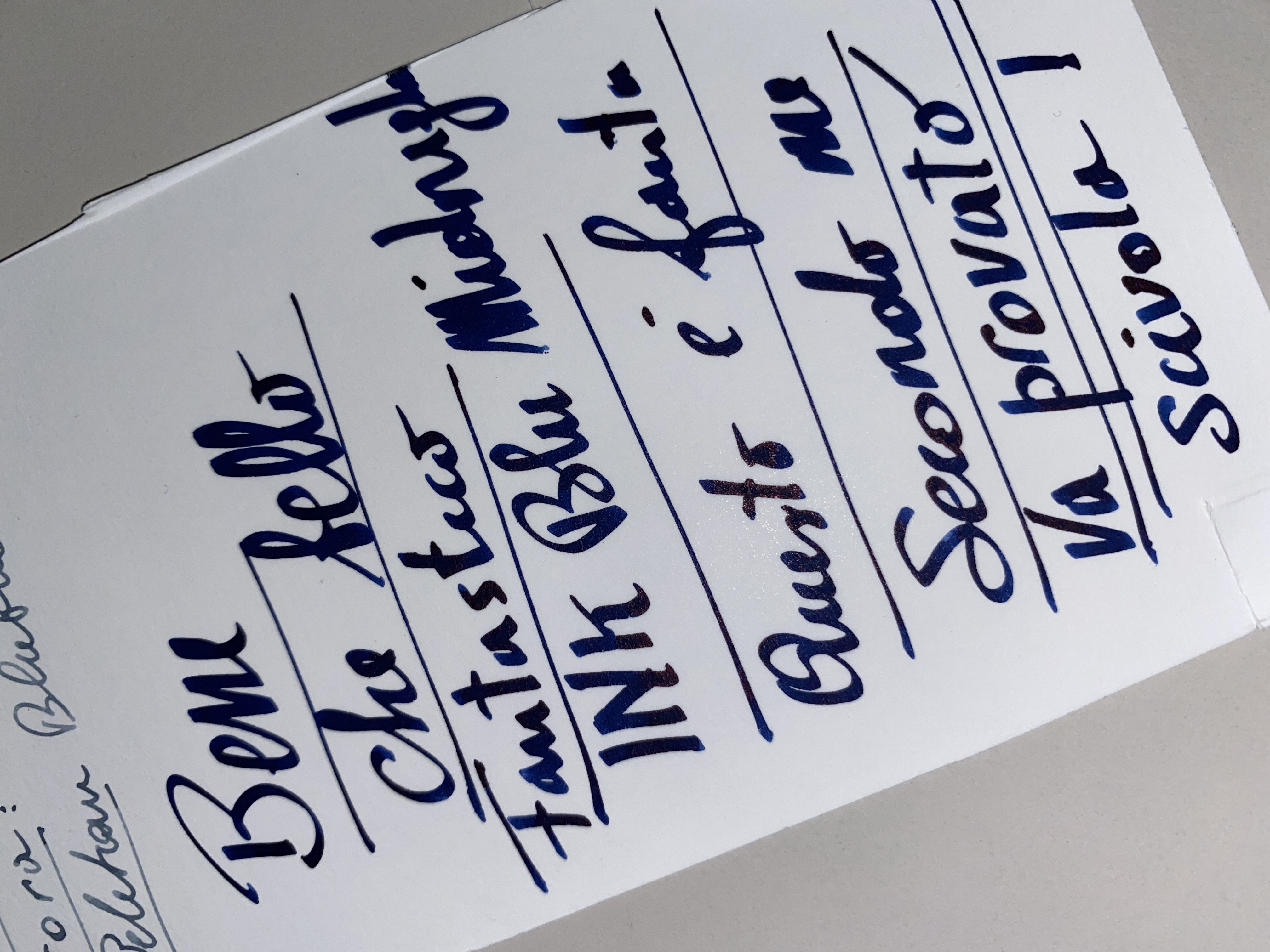 Diamine Sargasso Sea, molto bello, molto intenso, blu-blu vero, Occhio che è molto saturo, tende leggermente a intasare le penne se lasciato a lungo inusato. Produce sheen. Io a volte lo diluisco appena.