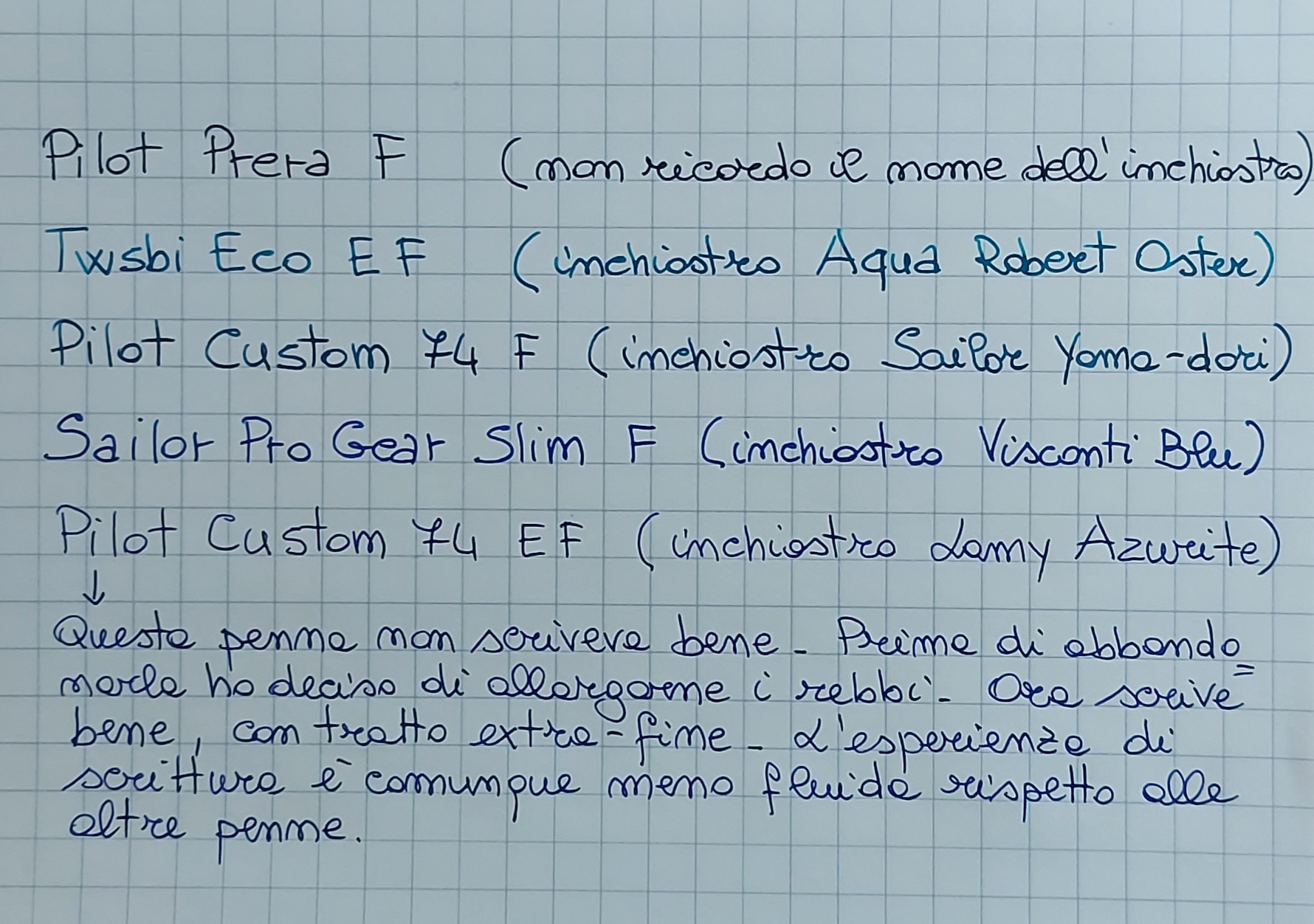 Aggiungo una prova di scrittura con le mie penne dal tratto più sottile. La carta è Tomoe River su quadretto da 5mm.