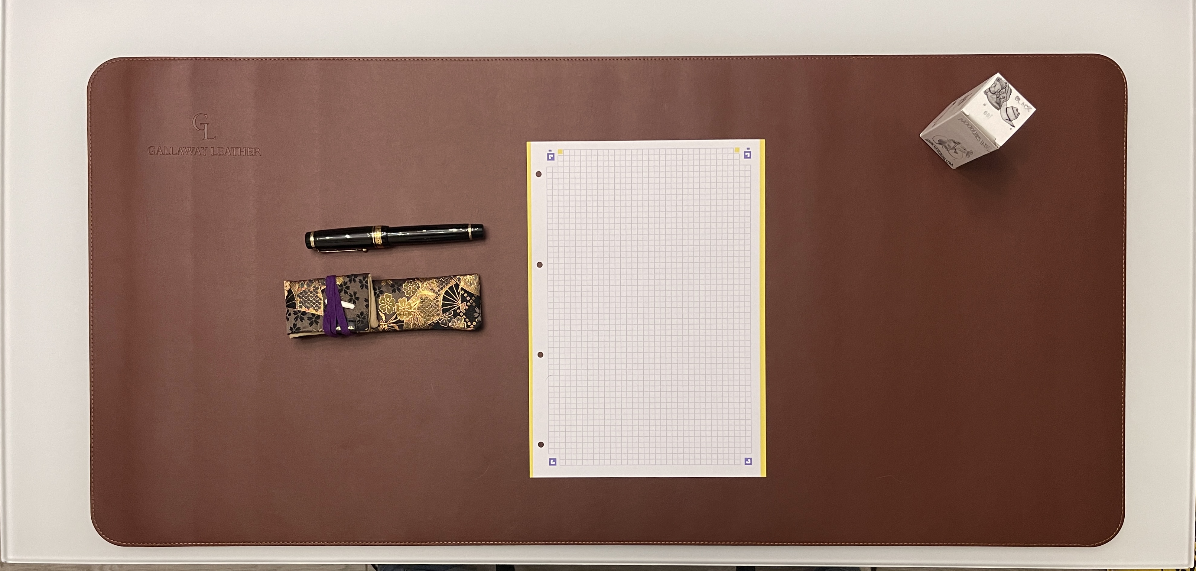 Nel frattempo ho aggiunto al mio scrittoio qualche contorno per rendere più piacevole ancora la scrittura: sono passato dai quaderni ai fogli singoli (non ho più i rigonfiamenti dovuti alla rilegatura che ondulano la pagina) e ho aggiunto un sottomano in eco-pelle che ammorbidisce il fondo. Con questo posso permettermi di scrivere anche su un foglio singolo senza avere un ritorno rigido dal tavolo, ma senza bucare il foglio quando si mette pressione. Essendo un oggetto da ben 20€, ve lo descriverò e consiglierò volentieri in un post dedicato.