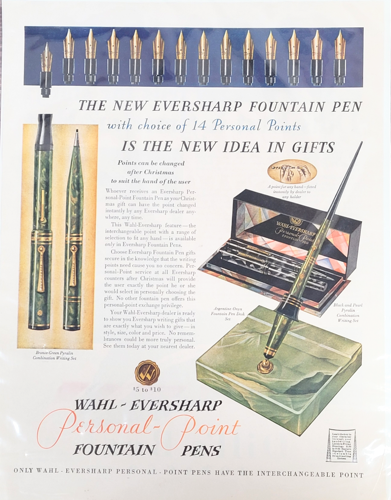 A questo proposito, avevo anche scaricato dal sito di vendite americano questa versione a colori della scatolina, che non mostra la data direttamente (nè la riportava con precisione il venditore), ma che potrebbe essere del Natale 1929. Dopo aver contenuto le "Deco Band" Personal Point da maggio 1929 come da Catalogo, alla fine dell'anno era ancora sulla breccia come "attraente" scatolina-regalo...