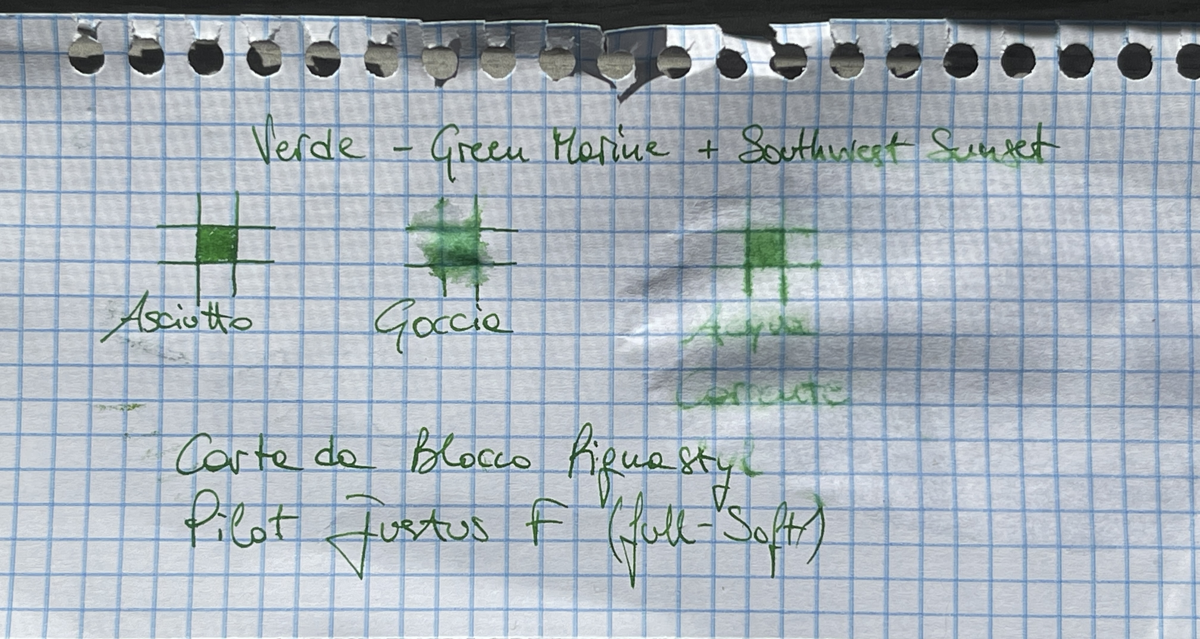 Mix in proporzioni uguali di Green Marine e Southwest Sunset (ex Apache) by Noodler’s. Ho usato il giallo per scaldare la tonalità