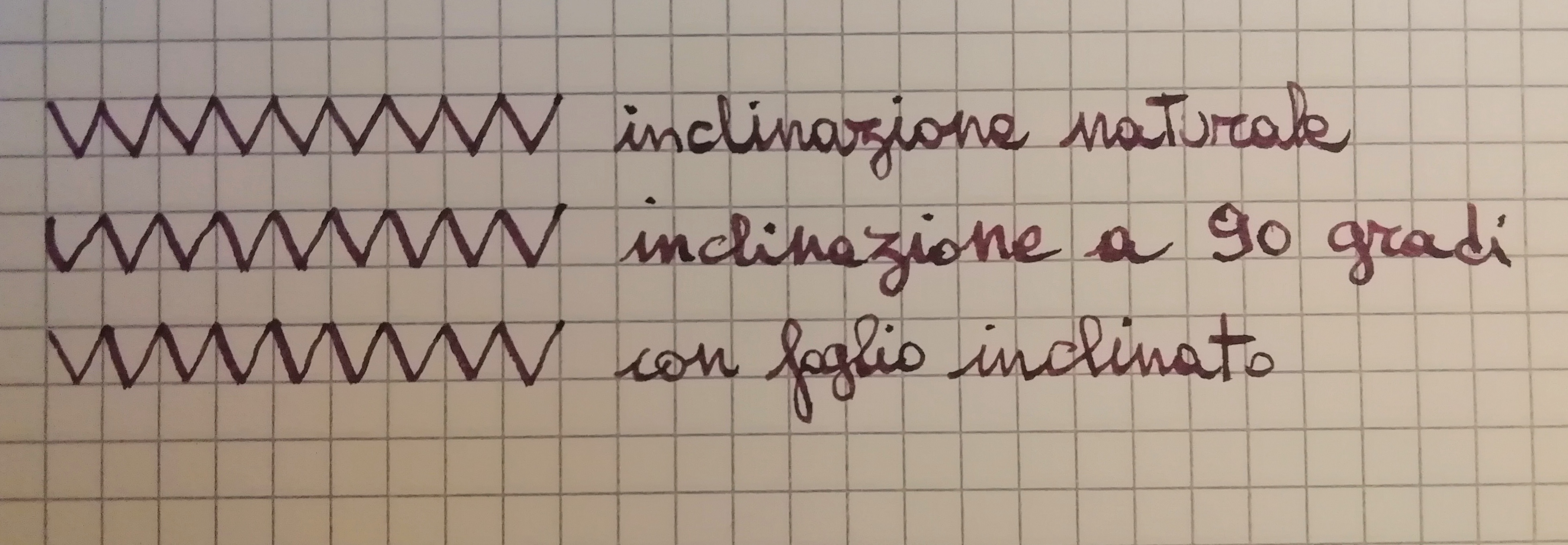 Se tieni il pennino a 0 o 90 gradi hai la larghezza di tratto maggiore nel tratto discendente o orizzontale, ma non la variazione di tratto maggiore (prova ;) ).