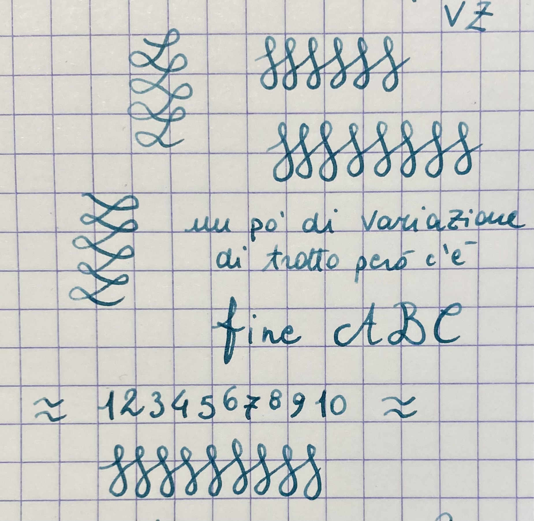 Già che ci siamo: il pennino non è così rigido forse. Con la mia solita mano leggera timorosa, mi ero fermata alla prima impressione. Stasera ho provato lievemente a premere sulle discendenti ed un po’ di morbidezza c’è. Forse mi aspettavo una cedevolezza eccessiva (o forse era la penna timida: adesso ha visto che le voglio bene)
