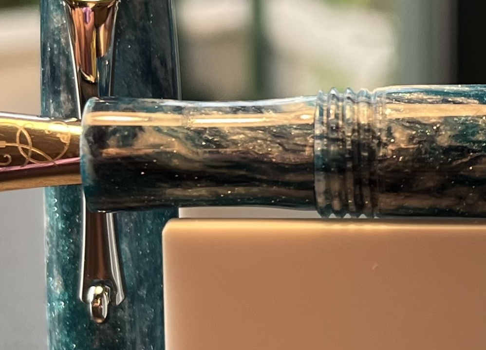 Grazie per le domande! il fondello è avvitato sul cappuccio un po' come nelle Pelikan (maschio sul "corpo principale" del cappuccio, femmina nel fondello) e presenta un incavo che funge da sede per l'anello della clip, la quale quindi si "incastra" in sede avvitando il fondello al cappuccio. Cappuccio e fondello sono torniti insieme in modo da non lasciare scalini, e solo dopo la tornitura esterna creo con una lima la "tacca" da cui esce il braccio della clip