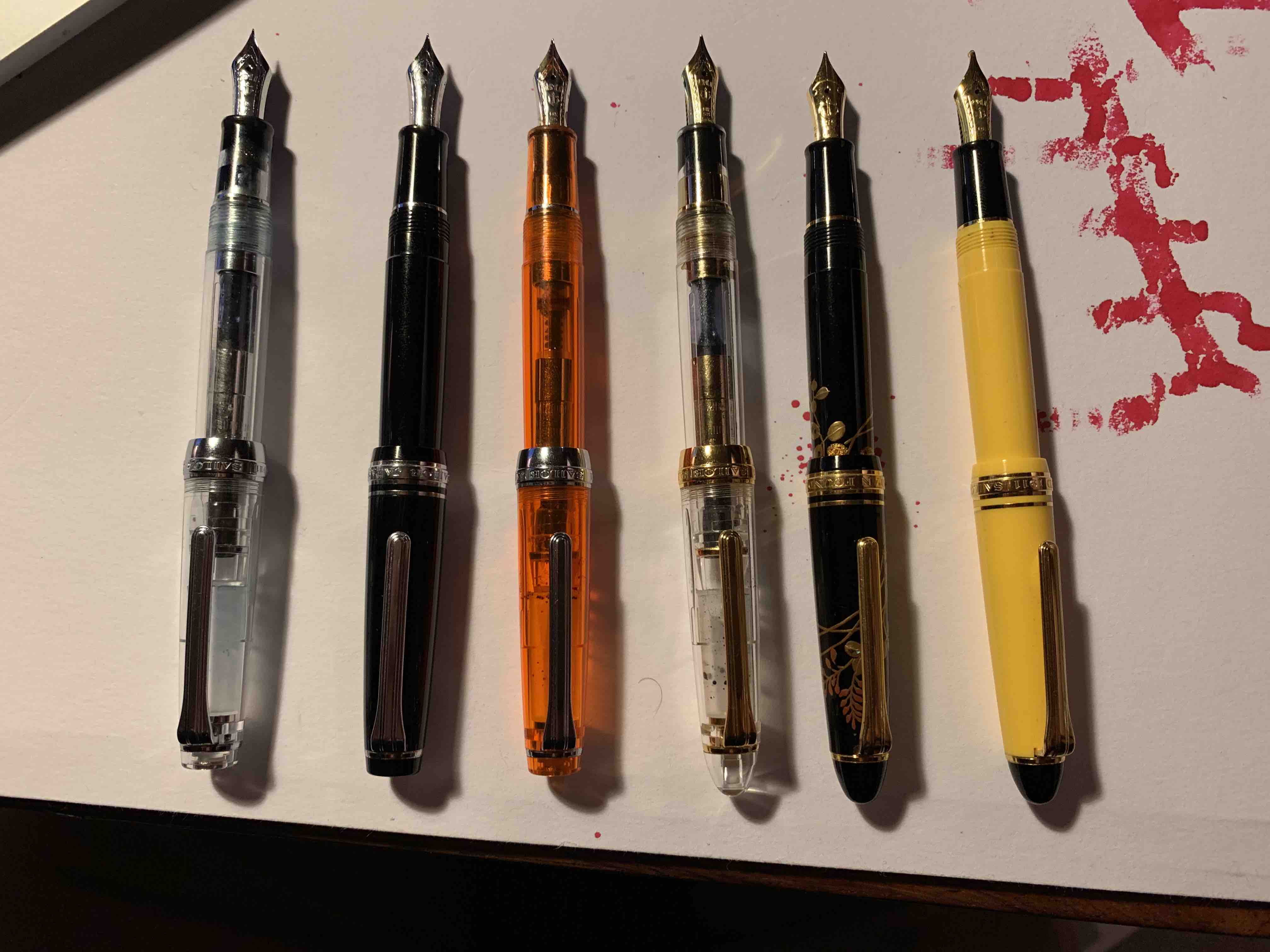 Da sx a dx: professional gear demonstrator slim HEF - professional gear slim black HF - professional gear orange demonstrator HMF - Sailor 1911 slim HM - Sailor 1911 slim Maki-E HM21K - Sailor 1911 Slim yellow MS Music nib . Nella EF metto il Sei Boku, la F ha un Robert Oster che va benissimo. Non sono penne che hanno problemi di flusso. La sensazione che dici tu cominci ad averla con una M. La M con Shin Kai che va come il burro.nime ha scritto: ↑martedì 1 gennaio 2019, 20:03Ma in teoria coi pennini F ed EF non servirebbe proprio un inchiostro fluido per avere la sensazione di "fluidità" burrosa più tipica dei pennini M? Oppure questa penna ha un flusso super abbondanteHoodedNib ha scritto: ↑martedì 1 gennaio 2019, 19:15 Allora piu' che il pennino questo e' qualcosa che ha che fare pure con l'inchiostro (almeno in buona parte), ti serve un'inchiostro che non favorisca troppo il flusso o meglio uno che asciughi rapidamente. Mi viene da consigliarti un inchiostro pigmentato perche' non sono sicuro che quelli ad asciugamento rapido non vengano perlopiu' assorbiti dalla carta stessa, spiumando.