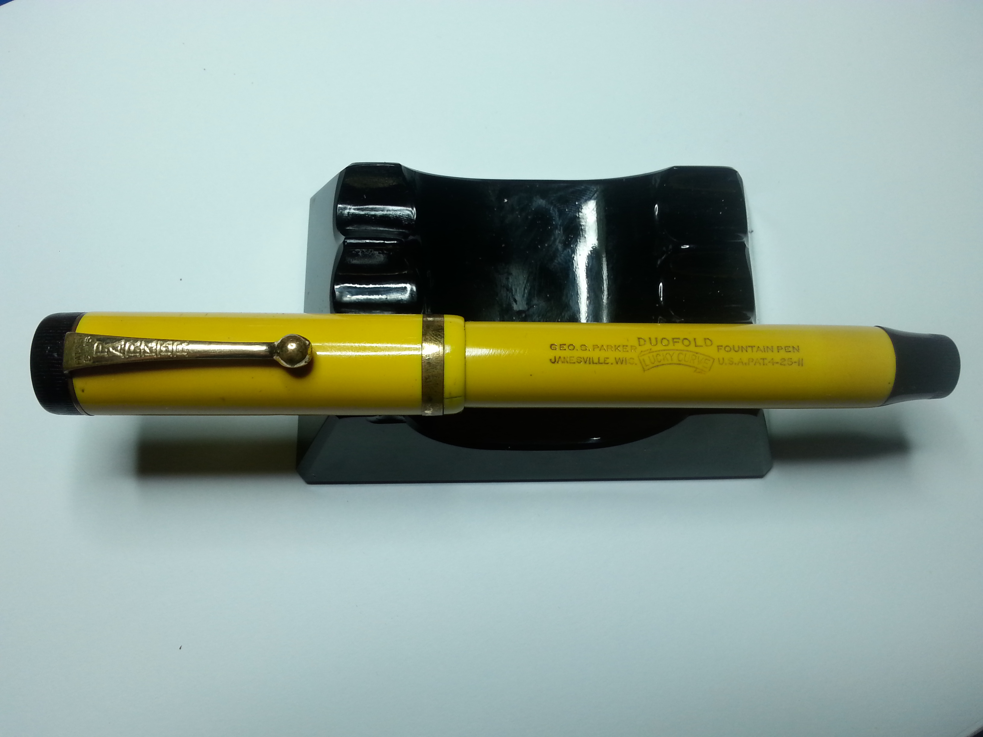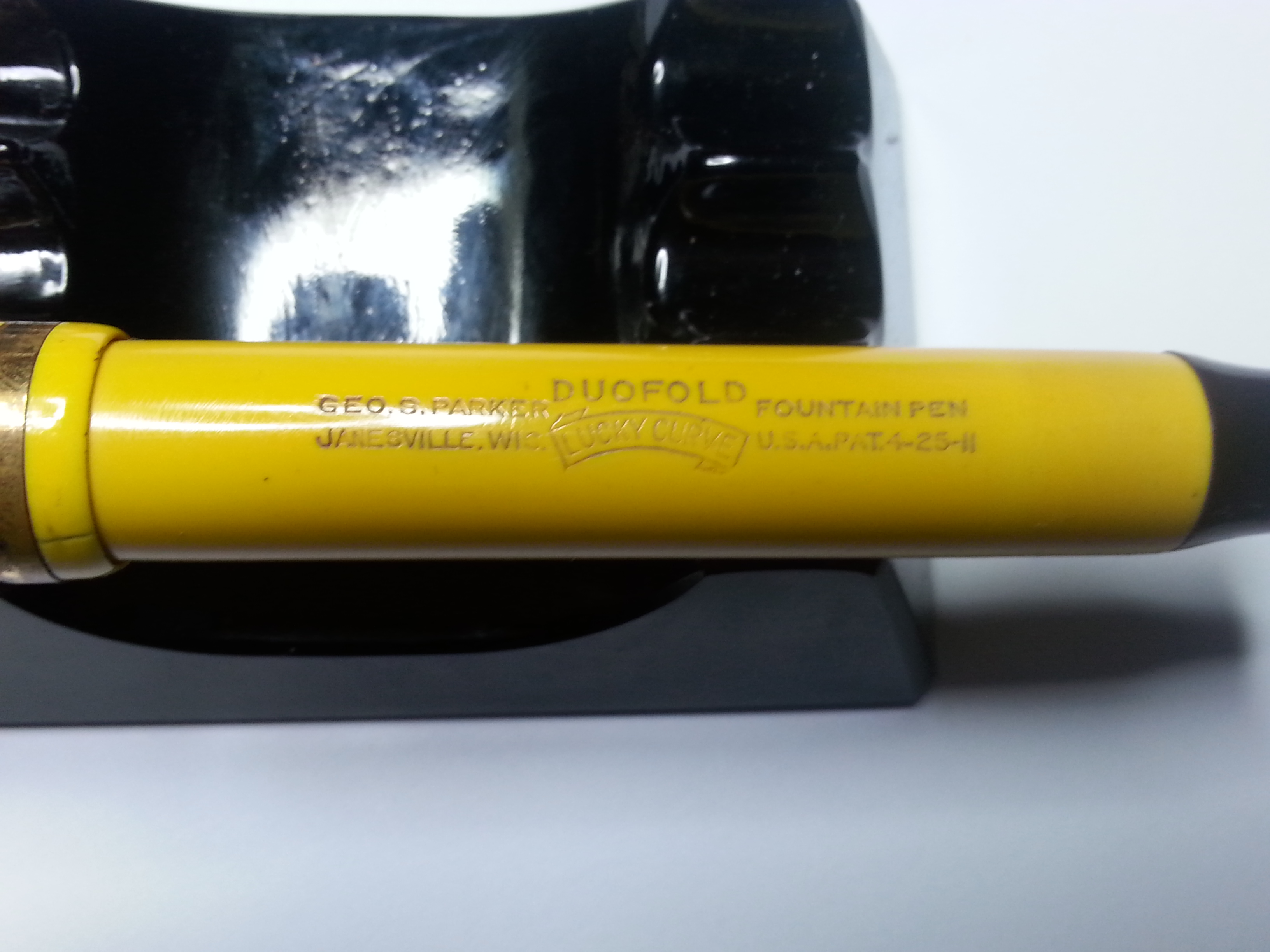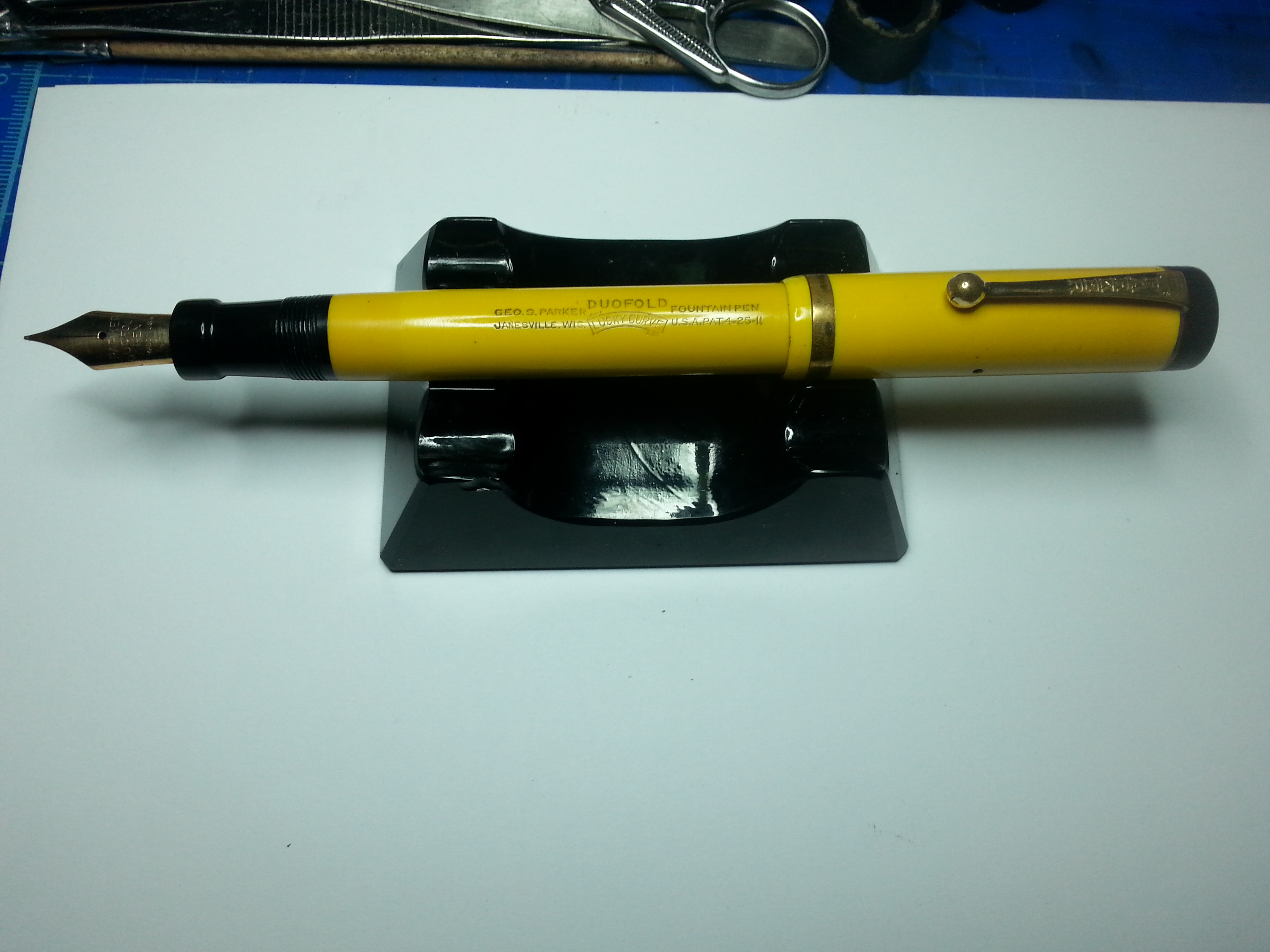 Guardo se trovo un pezzetto di giallo Duofold da mandarti, ma puoi anche utilizzabile la tecnica che io definisco come "autotrapianto", ovvero grattare con un attrezzo appropriato del materiale dall'interno del corpo della penna. Essendo una stilografica a pulsante di fondo la cosa non produce alcun effetto negativo e ti permetterà di recuperare un minimo di materiale, sicuramente del colore esatto, per eseguire la riparazione.