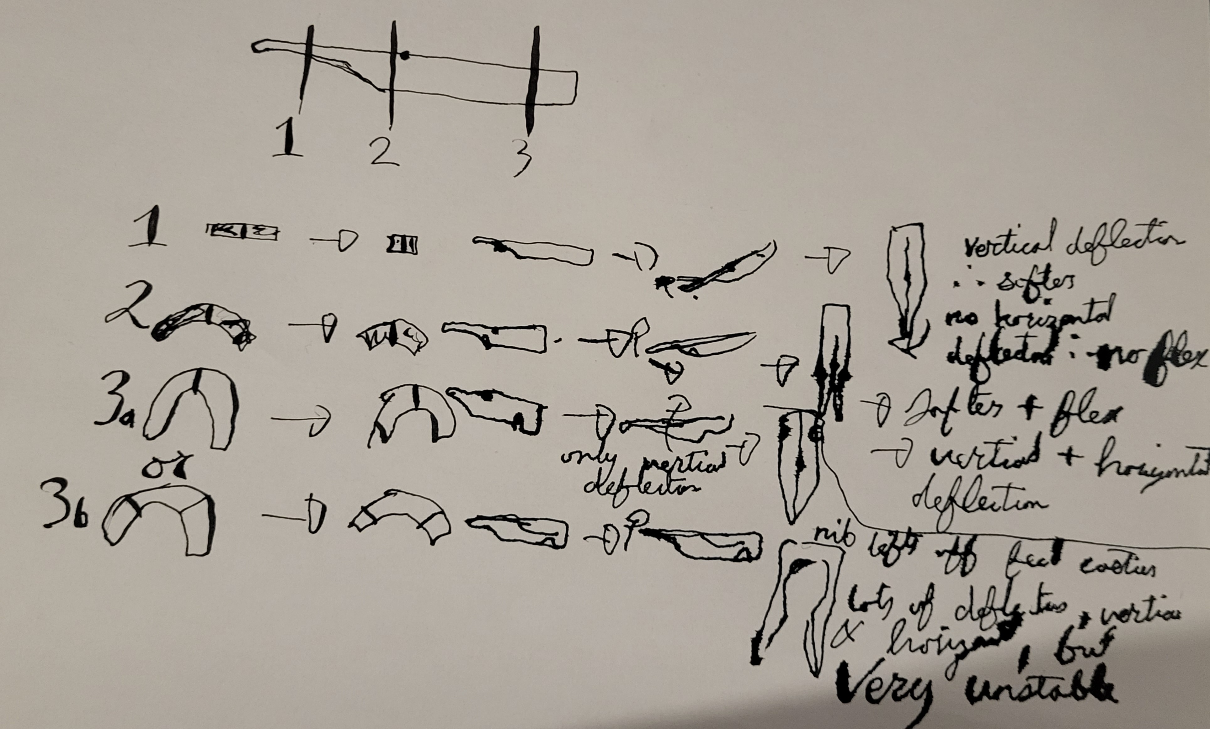1) aggiunta di tacche vicino alla punta: poca o nessuna curvatura in quest'area, quindi quando vengono aggiunte le tacche viene aggiunta anche morbidezza (deflessione verticale più semplice) ma la deflessione orizzontale non viene influenzata (nessuna flessibilità)