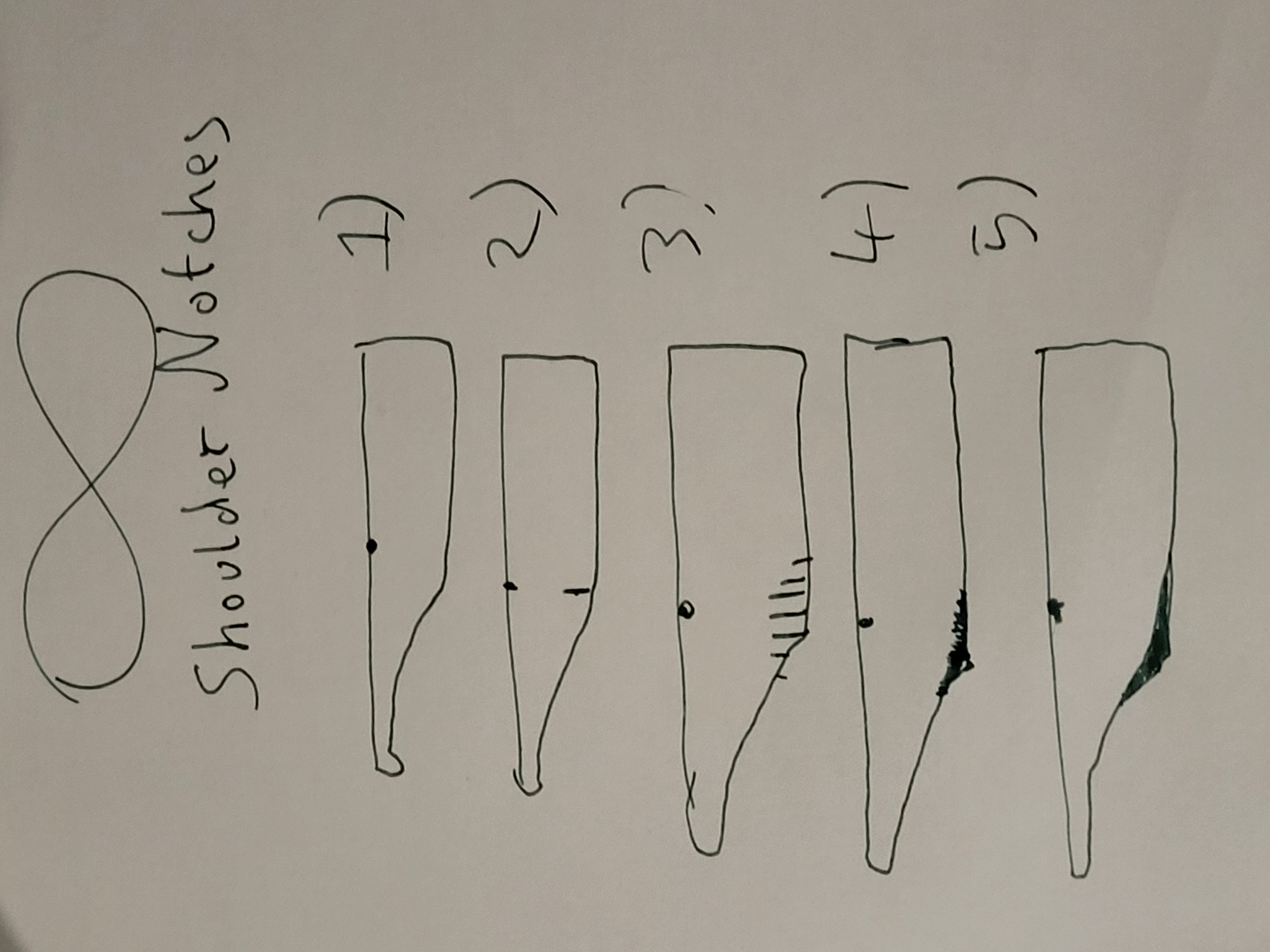 2) some curvature here, adding notches here has the same affect as removing the shoulders (one way to think of this is adding one large notch that removes the shoulders, or infinite small notches close together- either way removing the shoulders will have the same effect without creatibg a stress concentration). The effect is increased softness and ease of flex- by removing some of the material from the sides, it is easier to open up the tines. The nib will also move vertically a little. This is in front of the breather hole- especially important if cutting a split slit from the breather hole. This is because if you cut notches behind the breather hole while also having a split slit, we will have a durability issue shown in 3b)