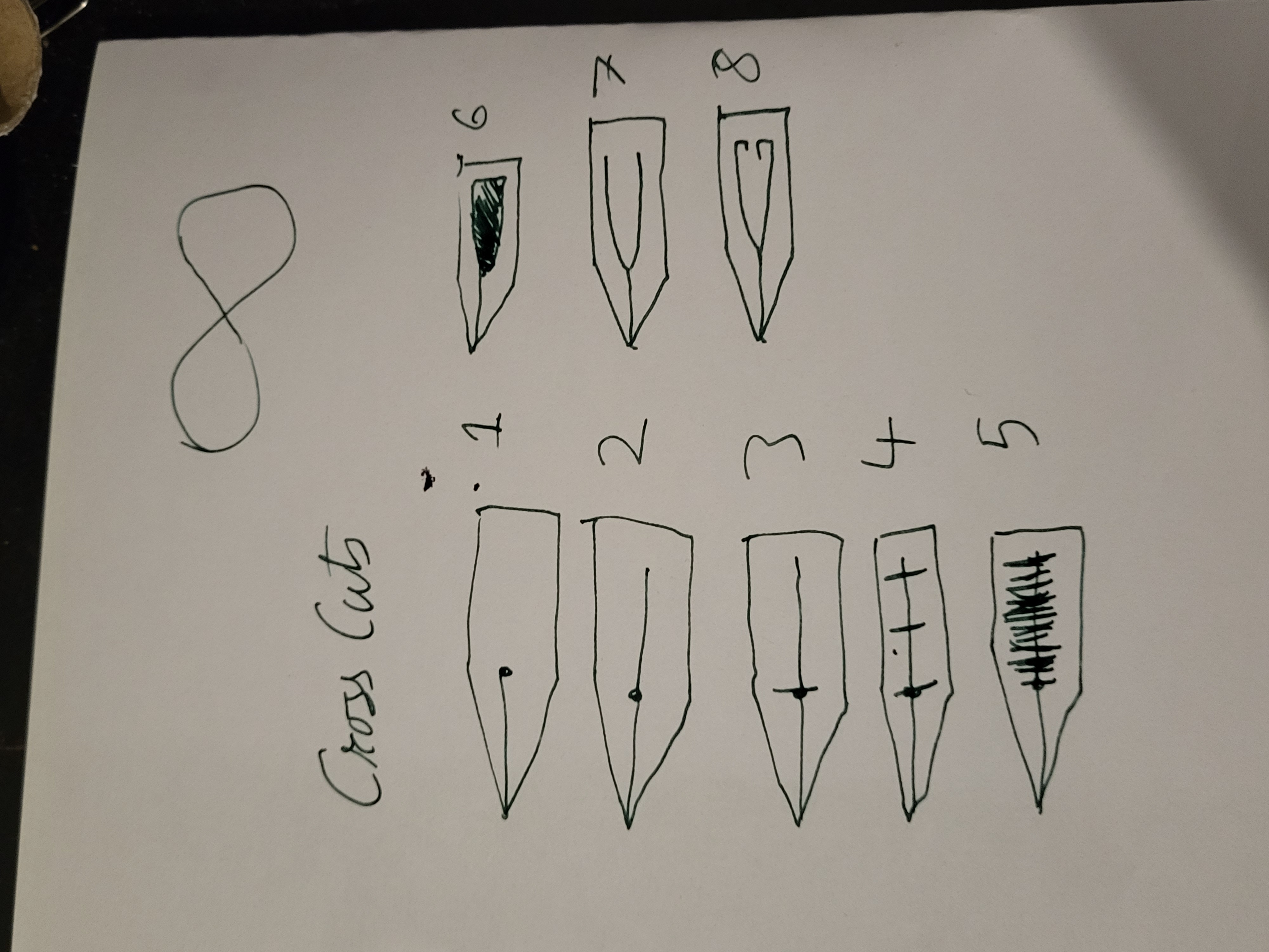 I will go through a few scenarios where we add notches at different points along the nib. For 1, 2 and 3a, it is assumed that the slit is extended but not split. For 3b, the slit is split.