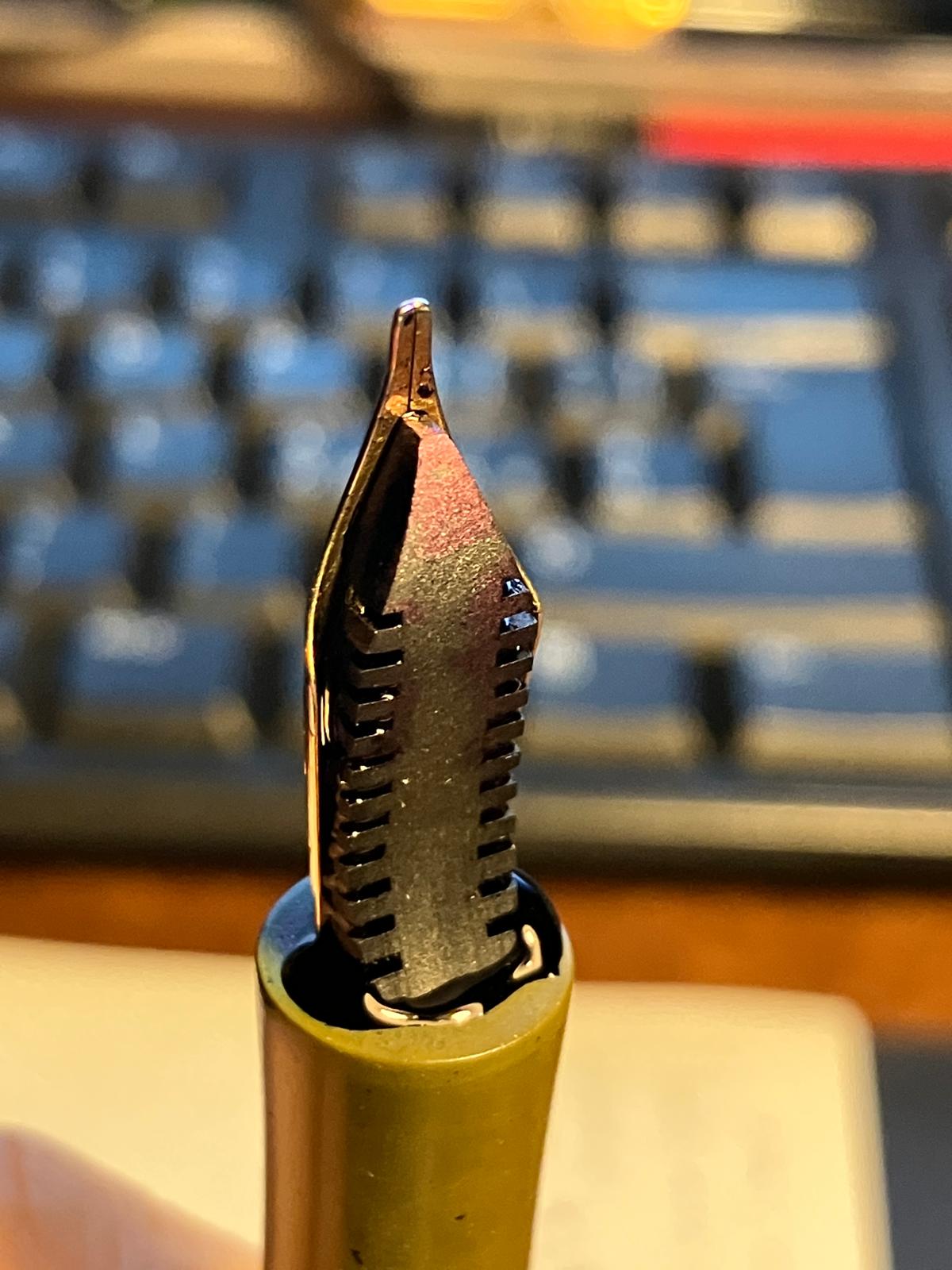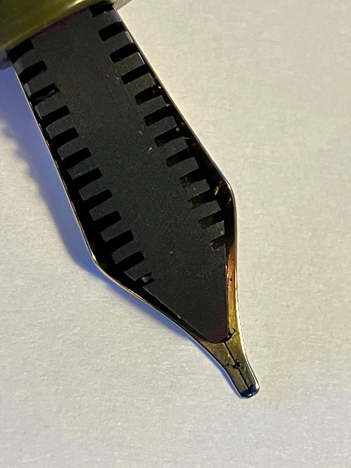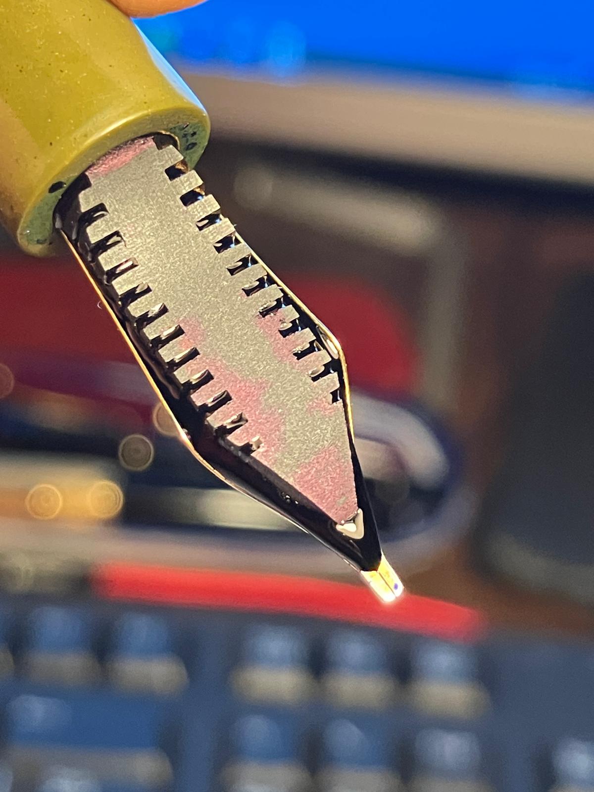 Finora ho usato il Diamine Majestic blue su tutte le penne provate; una prova potrebbe essere usare un inchiostro più secco, anche se non amo l'idea di usare un Pelikan blue black o un R&K Salix con questo pennino placcato, dovrei però avere un paio di marroni piuttosto secchi.