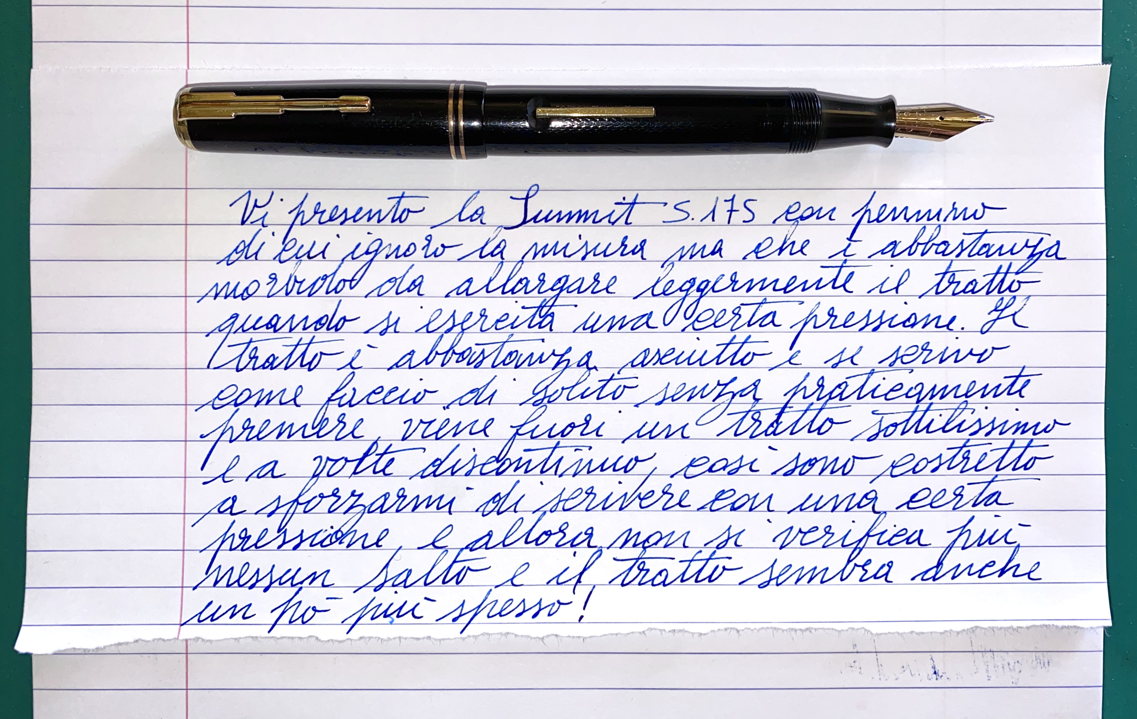 Acquisto eccellente, congratulazioni. La S. 175 mk 1 è una stilografica che, grazie al suo stile ed alla sua eleganza, può essere considerata un'icona degli anni Trenta. Introdotta nel 1935, fu la prima a montare il pennino n. 720, il primo di grandi dimensioni di Summit, maggiore, per esempio, del "Duro" di Conway Stewart. Fabbricata in Eternite, un particolare tipo di celluloide, promette moltissimi anni di soddisfazioni. È una stilografica che non temeva alcun confronto in termini di qualità.