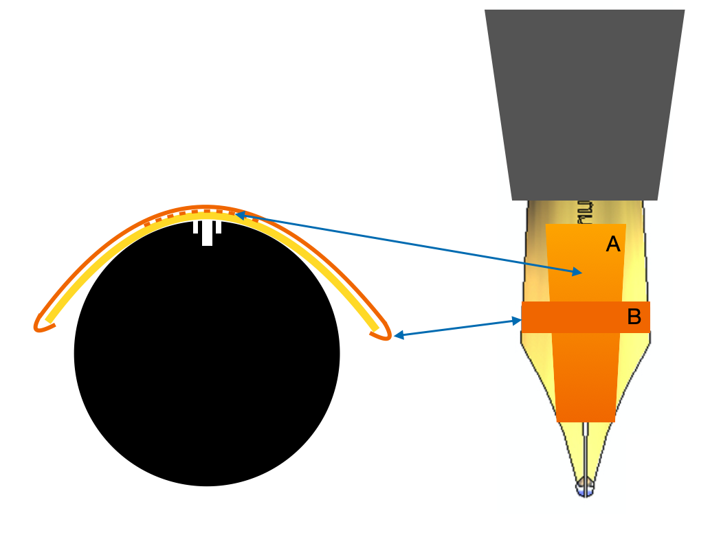 Ho provato anche io a fare un disegnino, sono piuttosto scarso a mano libera, ma ho tentato di riprodurre il pennino nel modo più simile possibile per spiegare i 3 passaggi fatti sul mio #6 (la parte ombreggiata indica la curvatura che avvolge effettivamente l’alimentatore, le frecce il punto più “debole” dove avviene la flessione).