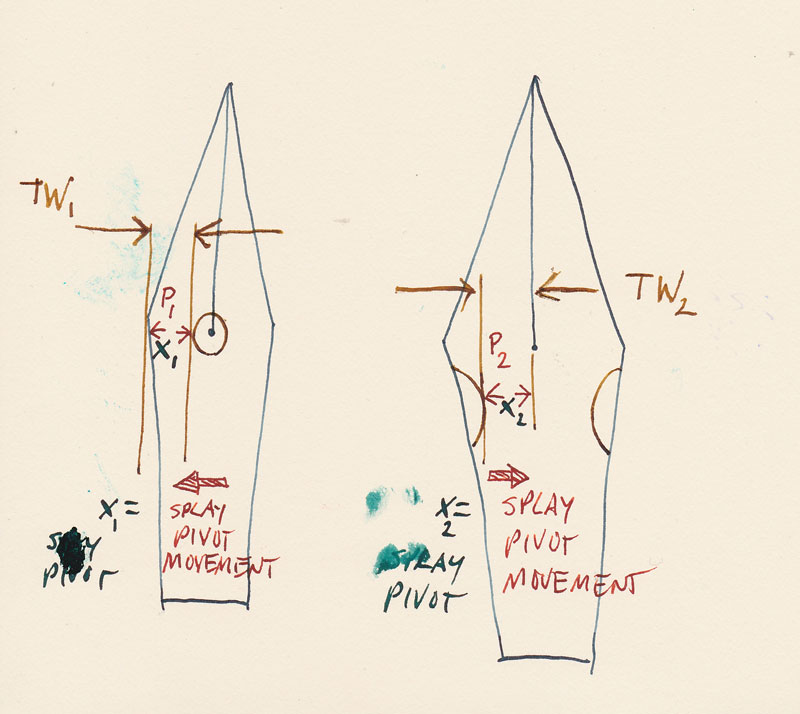 Bobje, super moderator di FPN, ad un certo punto, mostra questo suo disegno, nel quale cerca di spiegare come cambi la posizione dello "splay pivot" (fulcro di strombatura) quando si va a togliere materiale dall'interno del pennino o dall'esterno.