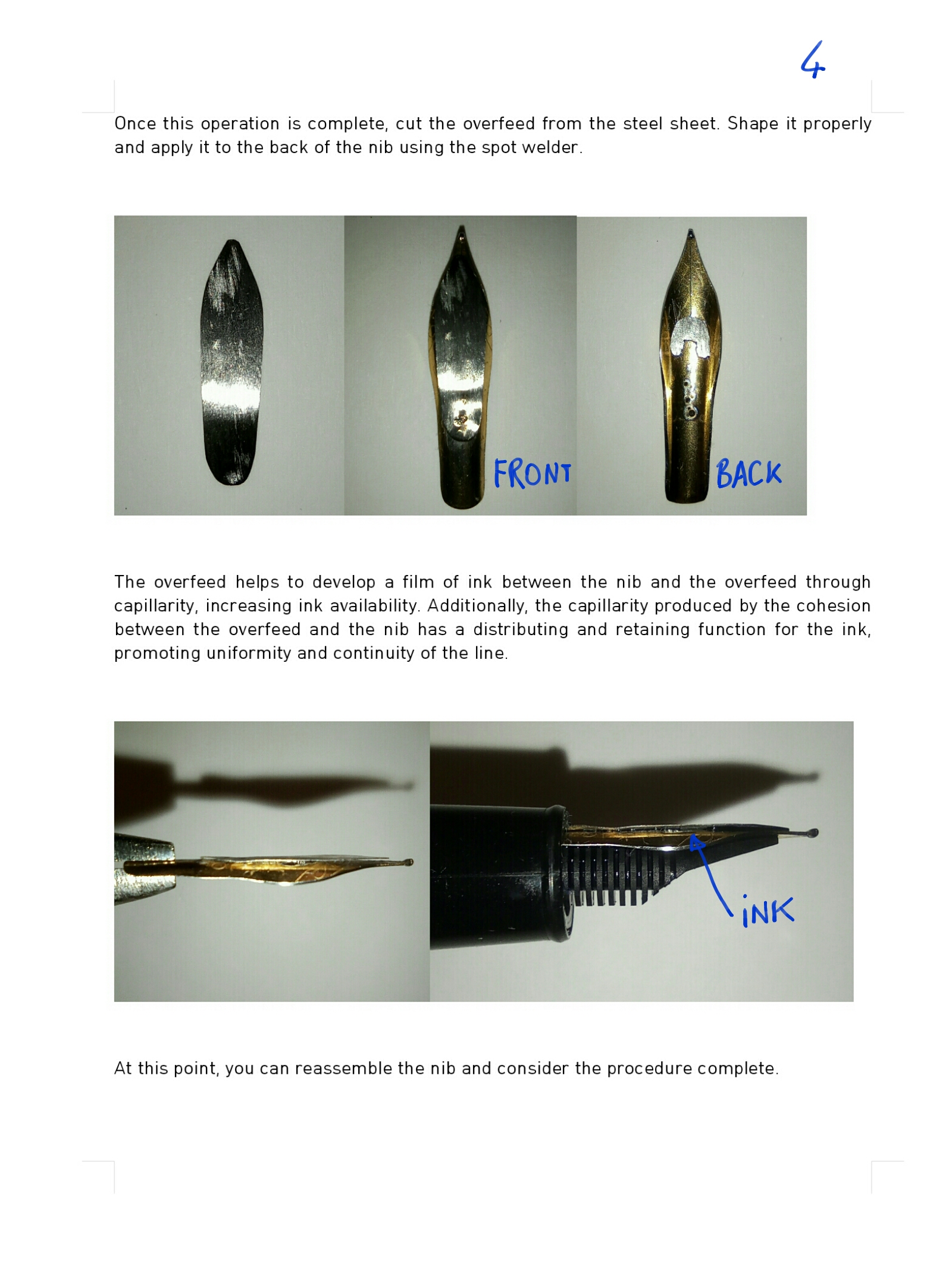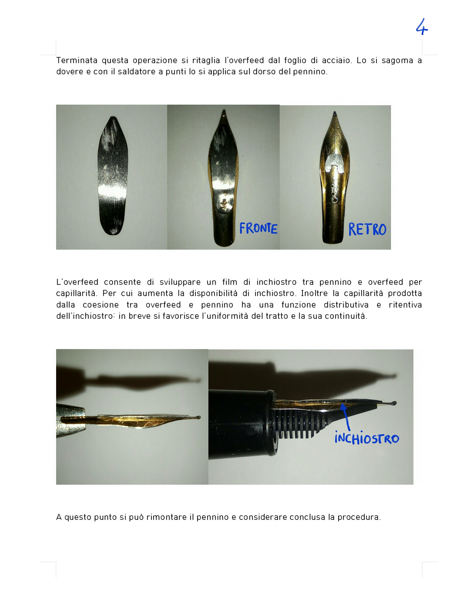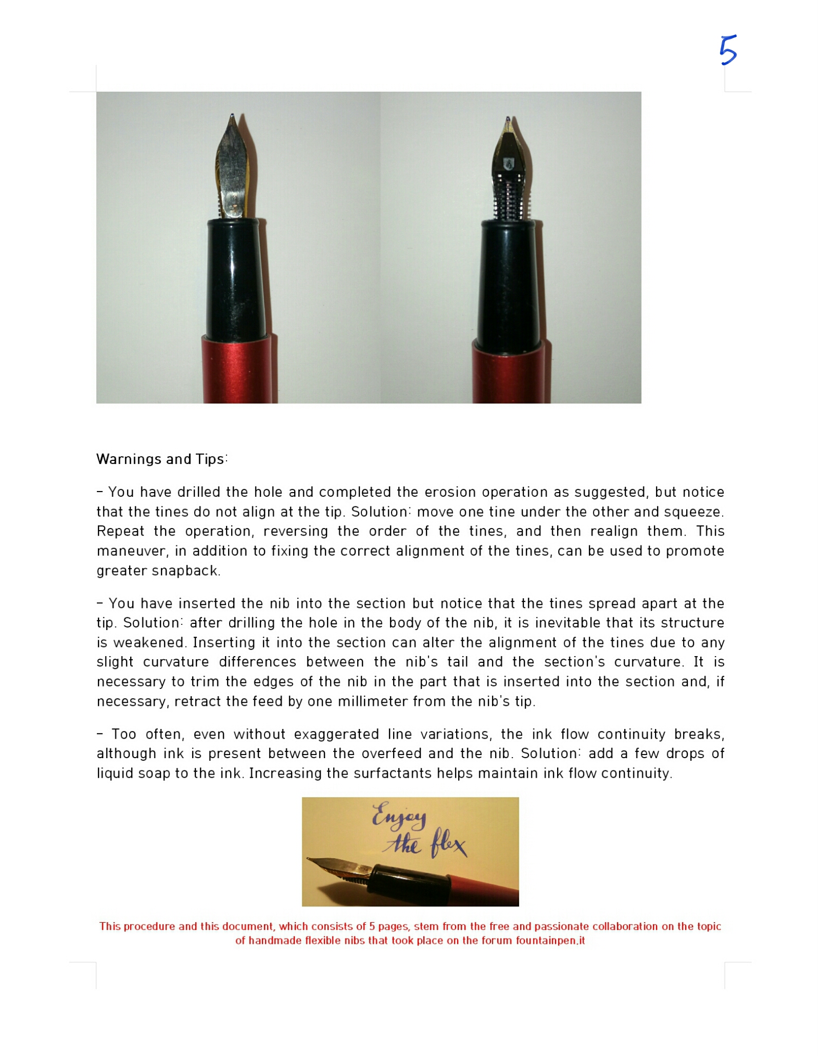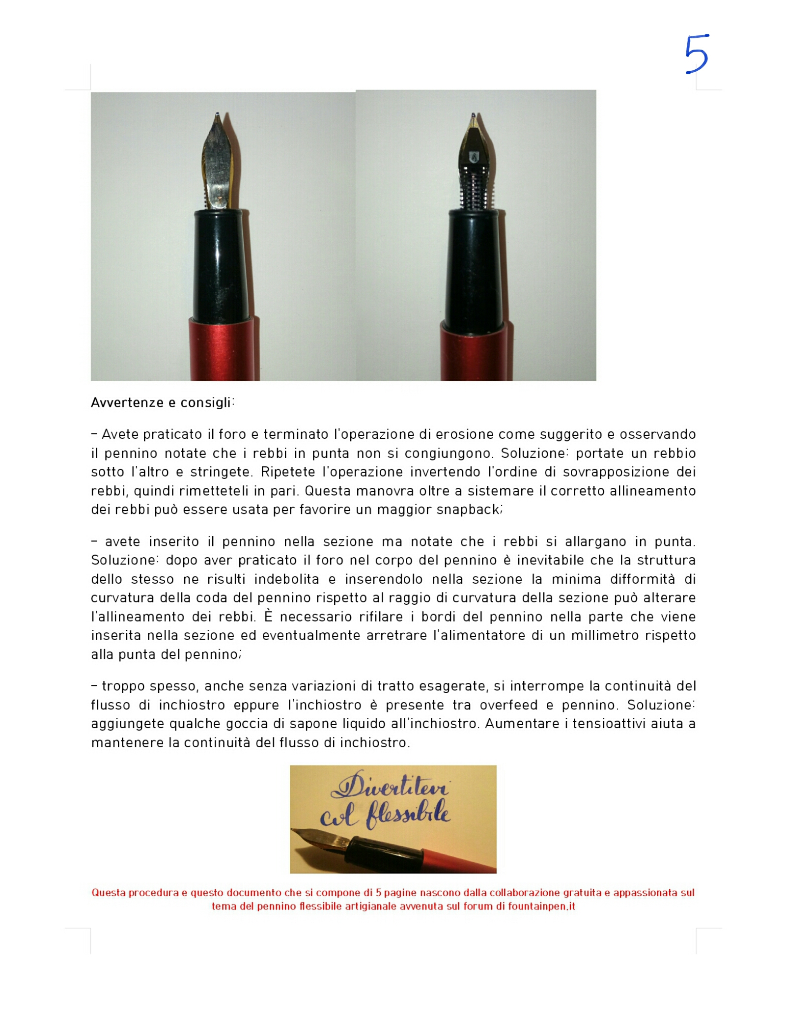 A mio avviso la causa è questa: mentre nel flessibile vintage costruito con una lega metallica molto elastica era solo la parte superiore (la punta) del pennino a flettersi, nel pennino in acciaio (meno elastico quindi) per ottenere una variazione di tratto apprezzabile è necessario spostare il momento elastico dalla parte superiore del pennino (la punta) alla parte inferiore (la base). Questo comporta un maggior distacco del corpo del pennino dall'alimentatore. A questo punto il flusso d'inchiostro è meno soggetto alla capillarità e sono prevalenti invece gravità e tensione di superficie del fluido. Praticamente il pennino agisce in maniera analoga ad un pennino da intinzione. Non è quindi il maggior diametro del foro di sfiato che aumenta lo scambio d'aria, ma il maggior diametro del foro di sfiato come pure altri interventi che producono un maggior distaccamento del corpo del pennino dall'alimentatore.