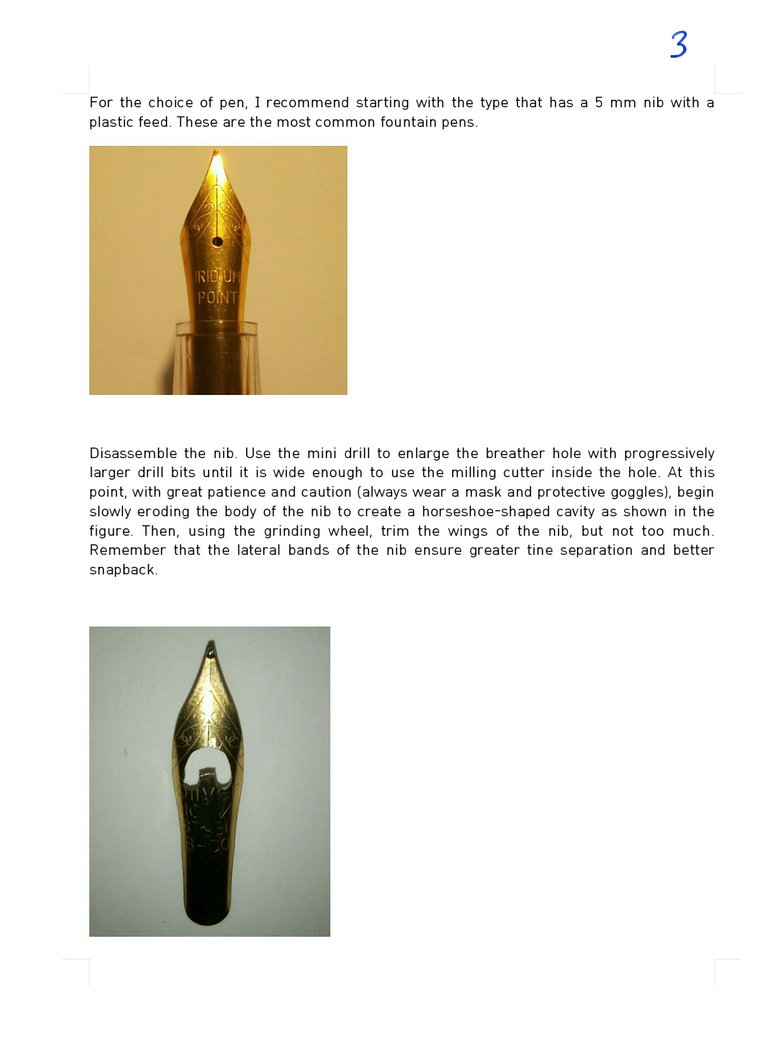 When it comes to flexible nibs in reviews and comments on specialized sites, one of the most frequent phenomena associated with these nibs is railroading. In the tests I have conducted to make a rigid nib flexible, this defect has never occurred; rather, the exact opposite has happened. The problem is the excess ink flow. Even on the FPN forum, those who enlarged the breather hole encountered the issue of too much ink flow. Erroneously, in my opinion, this phenomenon was attributed to a 'greater air intake' produced by the increased diameter of the breather hole. To be more precise: there is obviously greater air/ink exchange, but the cause does not lie in the increase of the breather hole diameter. The same phenomenon, in fact, also occurs in unmodified Indian flexible nibs (with a long slit). In this case, the phenomenon is just less noticeable because the line variation is minimal, but anyone who has used them, particularly size 6, has noticed the phenomenon.