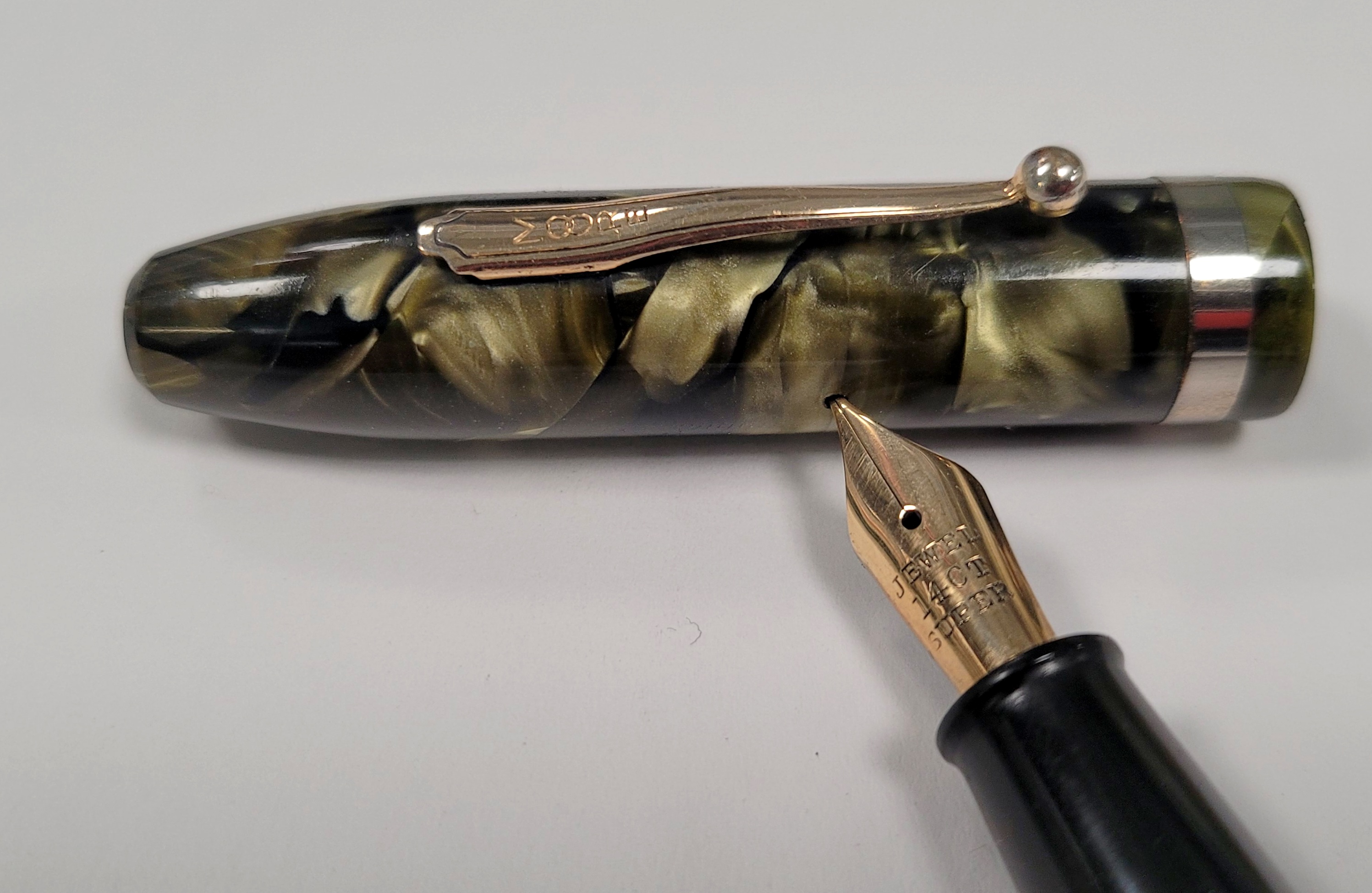 Celluloide verde/nero/avorio marmorizzato e pennino bello flessibile.
