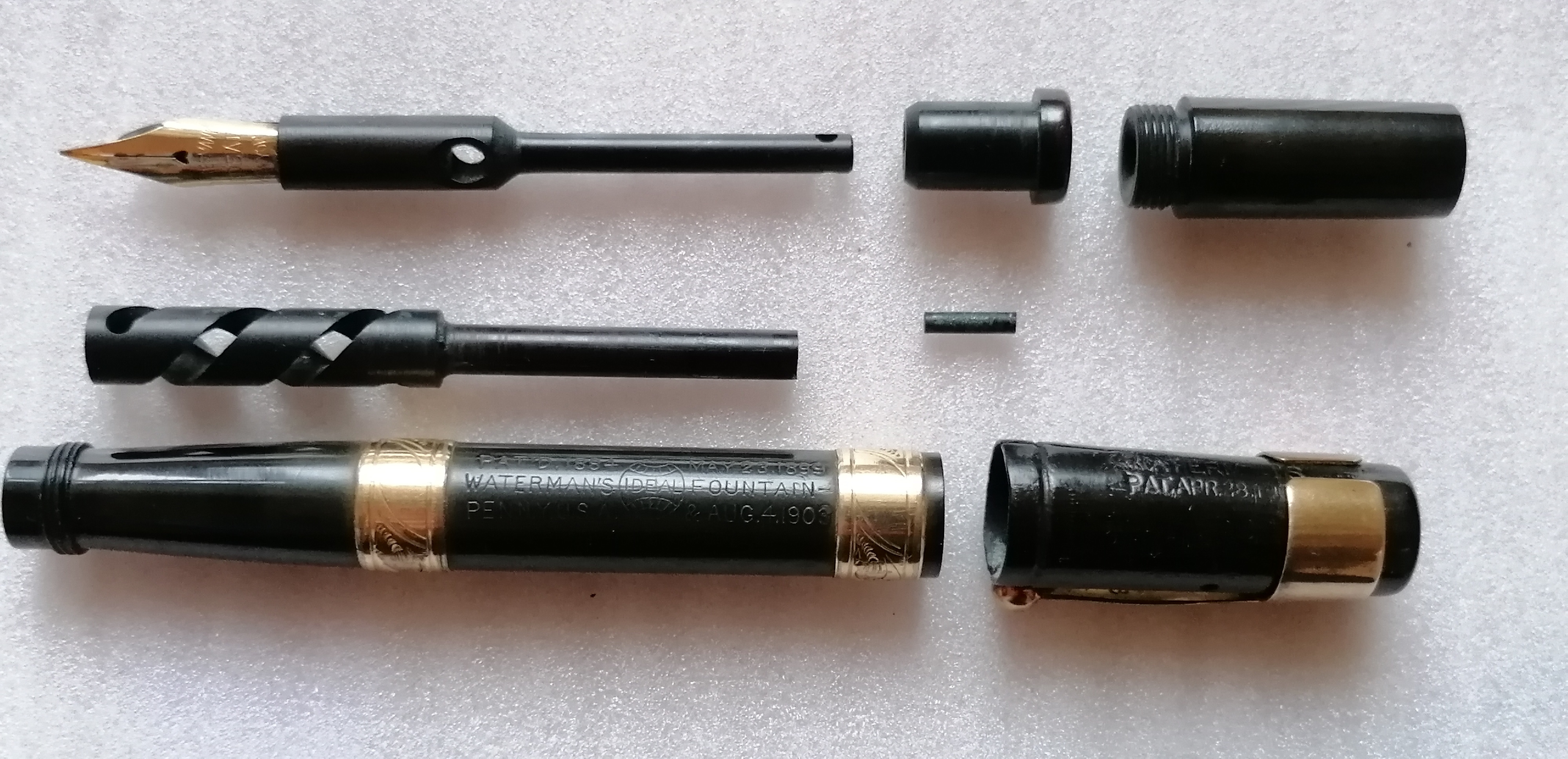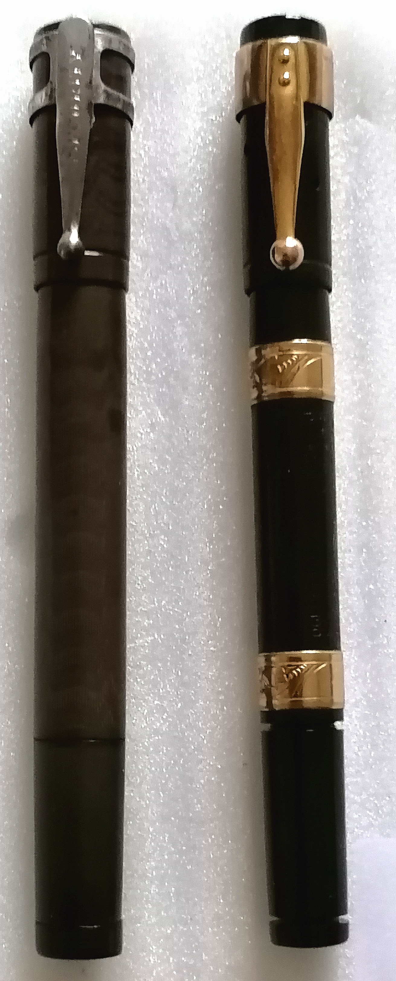 Sono due Waterman'S 12 (una 12 S ed una 12 1/2 V.S.), la prima devo ancora riportarla ad un colore decente con la soda caustica, la seconda ha la lavorazione con due anelli in oro cesellato... credo sia la 12 1/2 V.S. GM (Vedi pagina del catalogo nelle foto allegate).