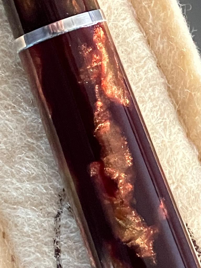 scusate le foto con il cell che non rendono giustizia al bel materiale, non è un buon periodo per foto dato il tempaccio che sta facendo... il pennino è un two-tone F 18k la penna è in celluloide color ambra (Stipula ha fatto anche la Etruria in questo materiale) il caricamento è a pistone