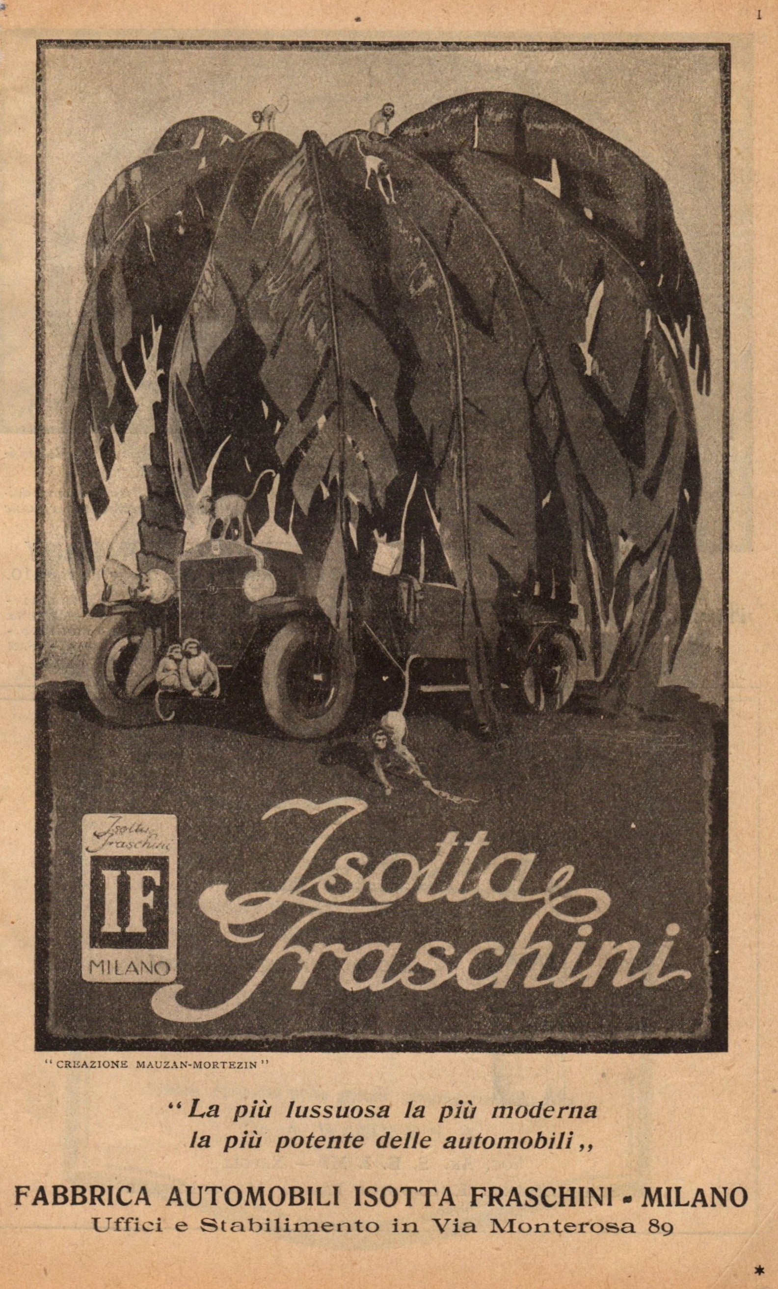 Stamani al mercatino dei Gaudenti di Trento ho finalmente trovato una delle mitiche pubblicità per Isotta Fraschini del grande Achille Luciano Mauzan, al quale la Casa automobilistica milanese aveva commissionato nel 1926 una campagna di grandissimo impatto, realizzata dall’artista con un coraggio che rasentava la follia: