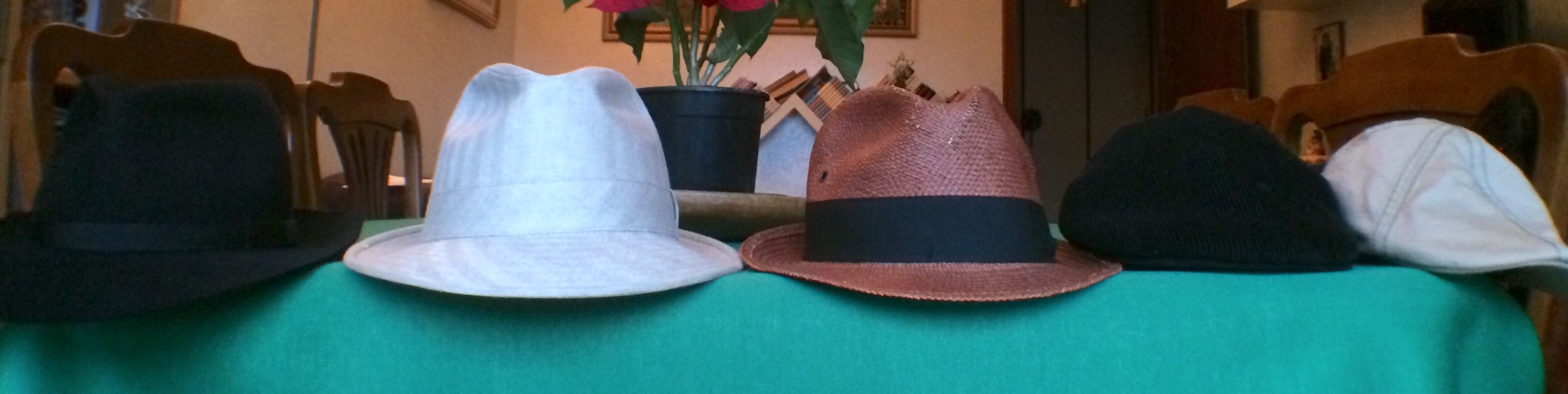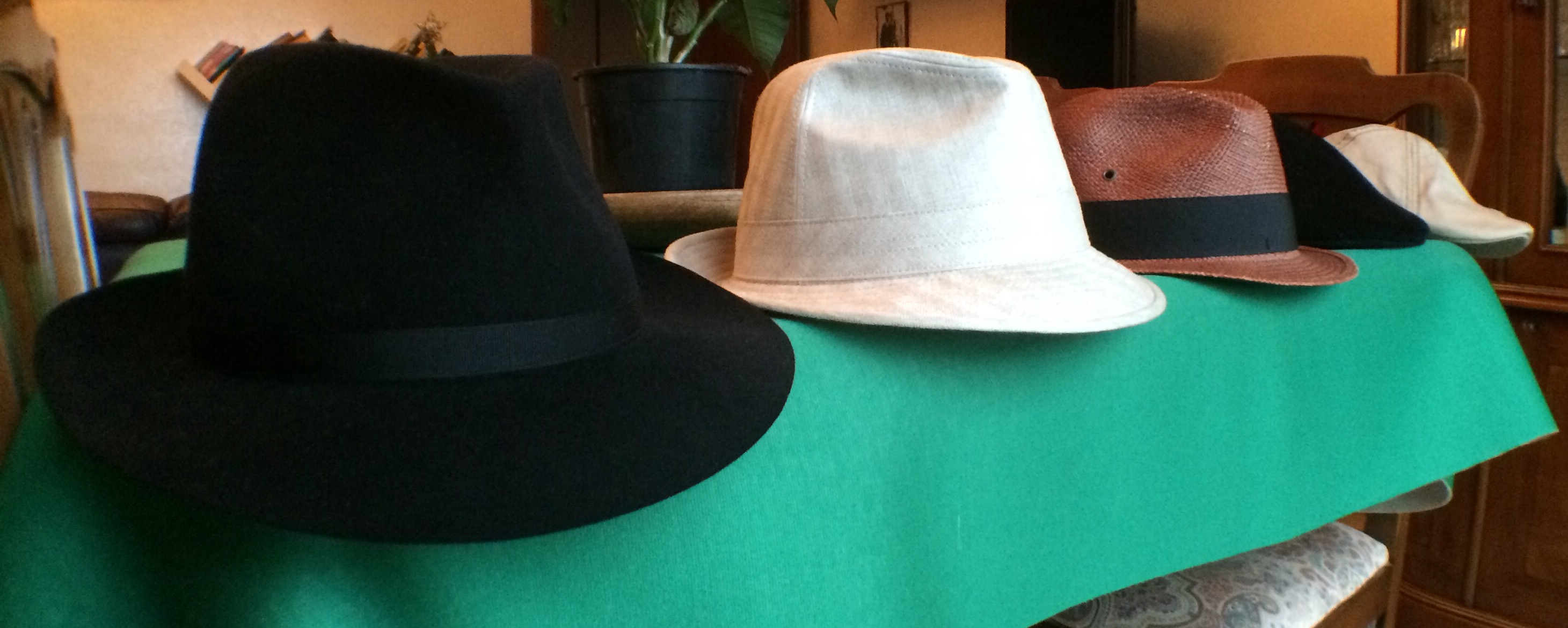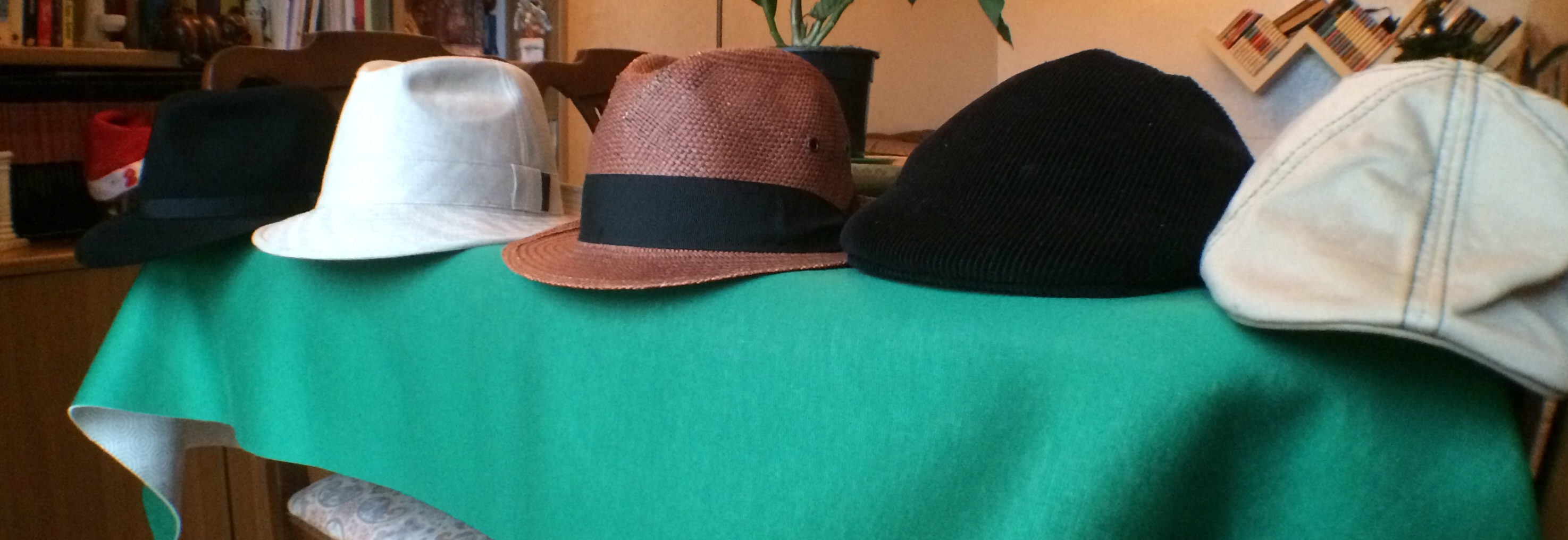 Partendo da sinistra, abbiamo il 'borsalino', ovvero cappello con tesa larga 6.2 cm la cui parte frontale si piega all'ingiù, come in foto; è fatto di feltro di antilope ed è un Guerra, azienda italiana fondata nel 1855. Segue poi il trilby, che essendo fatto in canapa è più adatto alle stagioni calde e la cui tesa è, come detto in precedenza, più corta (circa 4cm) e 'fissa', ovvero tenuta in forma dalle cuciture, così come sono tenute da cuciture le due 'pizzicottate' della calotta; è prodotto dalla Borsalino di Alessandria. Abbiamo poi il panama, con le stesse caratteristiche del trilby precedente (a parte il materiale, ovvio); è prodotto a mano in Ecuador per conto di una ditta italiana, la Etichetta Toscana, ed è sicuramente il cappello con la qualità più bassa di tutti (la paglia è già segnata ed è rigido, per cui non si può arrotolare come i 'veri' panama, solitamente bianchi). In fondo abbiamo i due 'driving cap' o coppola: quella nera, in velluto e foderata internamente, è il modello invernale ed è sempre della Guerra; quella più chiara, invece, è il modello estivo - in cotone elasticizzato - ed è prodotta dall'americana Stetson.
