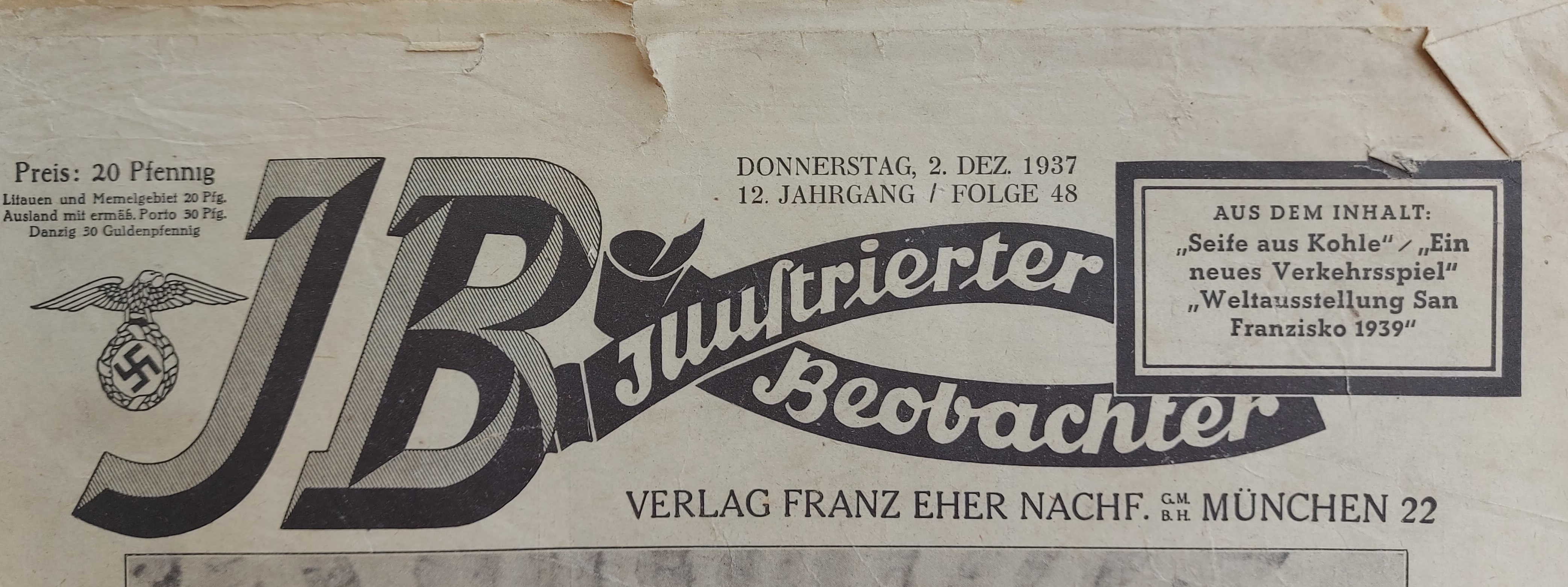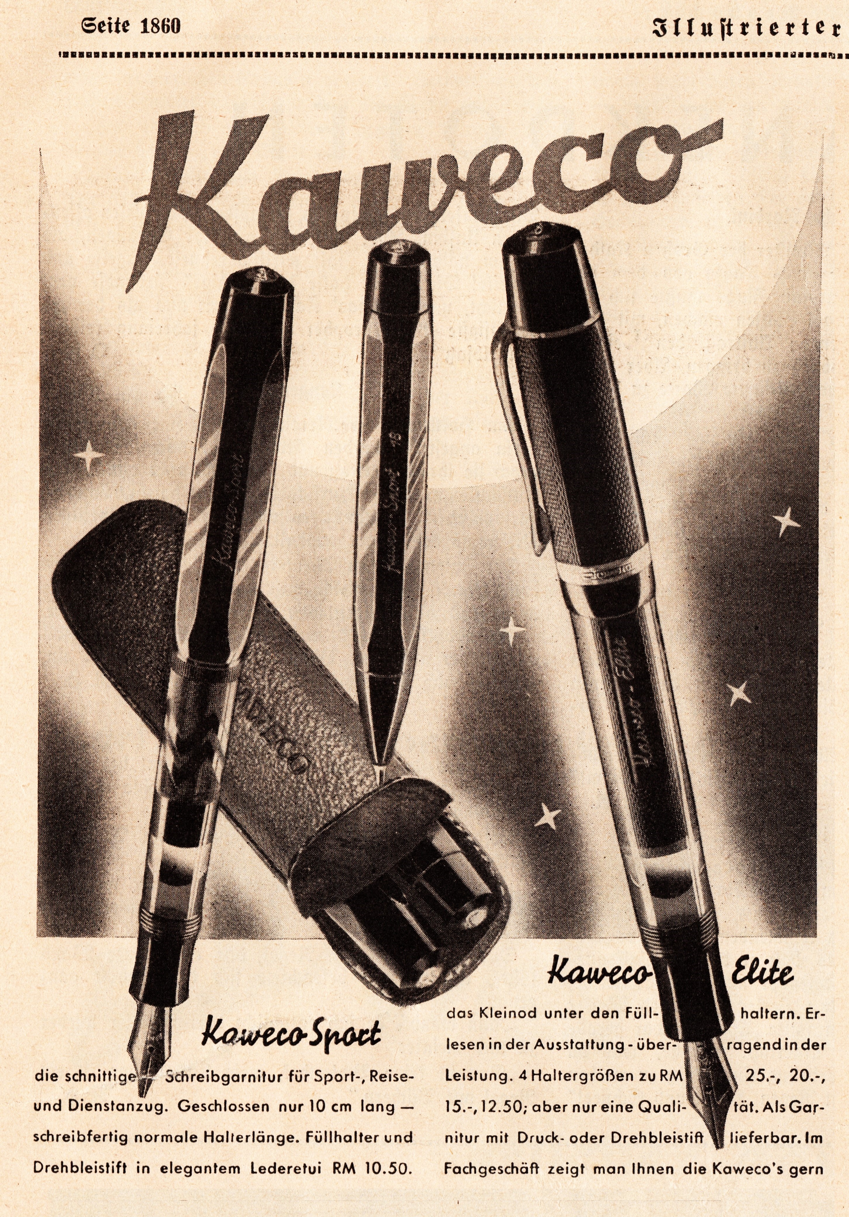 All’ultimo mercatino di Bolzano ho recuperato questa non comune pubblicità Kaweco. La testata da cui è tratta è «JB - Jllustrierter Beobachter» (=L’Osservatore Illustrato), rivista pubblicata a Monaco di Baviera dal 1926 al 1945. Si tratta di una pubblicazione di propaganda del partito nazionalsocialista con cadenza dapprima mensile, in seguito fino anche settimanale. Ovviamente, l’obolo delle inserzioni pubblicitarie su giornali graditi al regime era un modus vivendi che si può riscontrare in molti dei produttori (di ogni genere merceologico) sotto tutte le dittature: sui pochissimi altri numeri della rivista che in questa occasione ho potuto consultare (che però non ho acquistato) in campo stilografico ho visto anche pubblicità della Soennecken e della Artus.