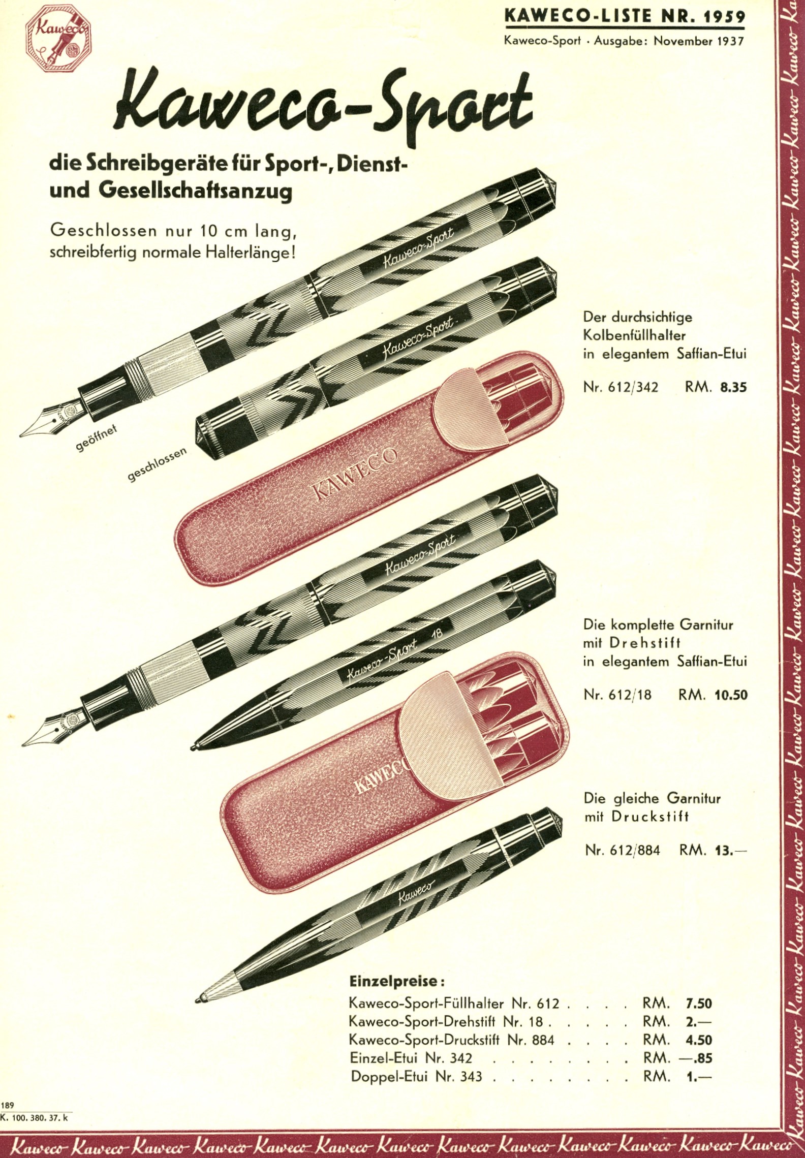 Questo mio conferimento segue di solo un mese la pagina di Listino (Novembre 1937, allegata qui sotto, ma anche precedentemente nell’articolo) che era un tempo disponibile sul sito della Casa, ma ora non più. Purtroppo il disegno della nuova pubblicità da me conferita non aggiunge l’unico dettaglio che personalmente mi interessava verificare, ovvero la numerazione della stilografica che proprio nel 1937 secondo il Listino veniva venduta come <Nr. 612>, in coppia con il portamine #18 (Drehstift= portamine “a rotazione”) o con il portamine #884 (Druckstift= portamine “a pulsante”), in astuccio singolo o doppio. KAWECO Liste nr.1959 – 1937.11 – pag.3 (fonte Kaweco)