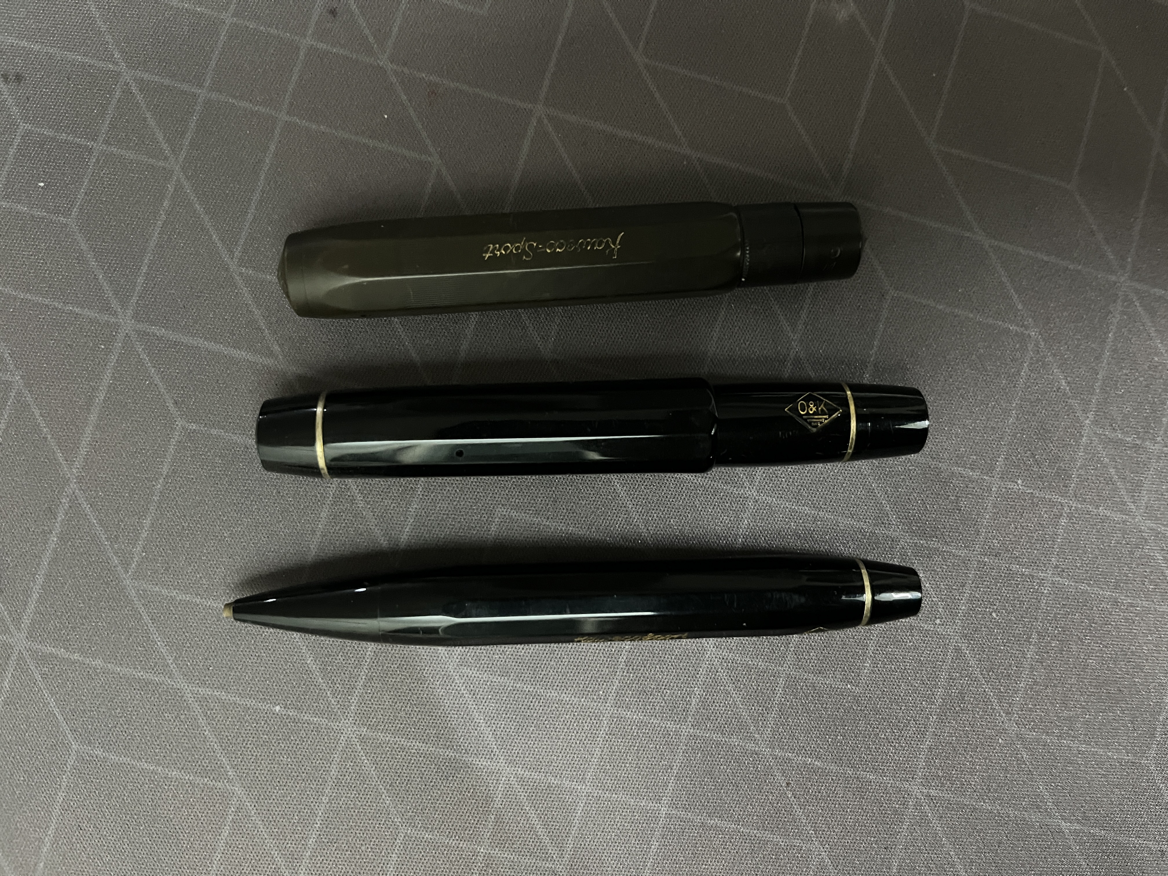 Rileggere (dopo quasi 7 anni) il dettaglio relativo alla lunghezza dichiarata della prima stilografica Sport chiusa/capped (=10 cm), mi ha indotto a misurare nuovamente i miei due esemplari, e devo dire che la seconda Sport che ho presentato (quella tutta in celluloide nera con finestrella verde) è esattamente lunga 10 cm, mentre l’altra che avevo a suo tempo misurato “soli” 9,7 cm, probabilmente aveva risentito della “consumazione” delle estremità (dovuta alla manipolazione) e un poco anche all’usura della filettatura del fusto trasparente (in celluloide ambra) per i ripetuti avvitamenti del cappuccio. Per cui, col senno di poi