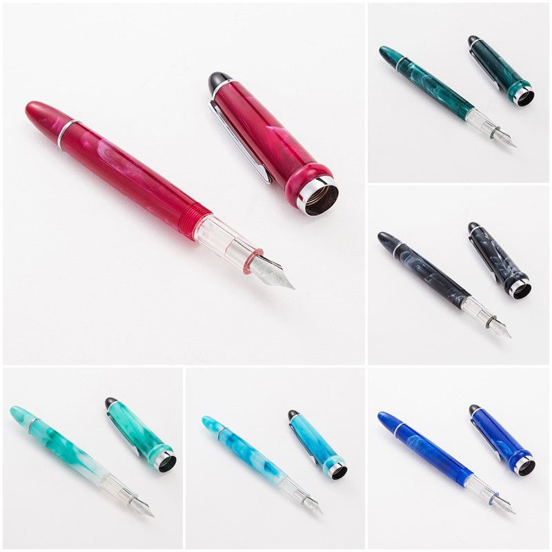 Boh, le mie due sono felicemente arrivate senza graffi. Il cappuccio a scatto chiude bene, e postato sul retro, pur non avendo un fermo vero e proprio, mi pare stabile, per il momento (è da poco che ne utilizzo una, l'altra è ancora intonsa). Pennino F alla Pelikan, scrittura molto buona.