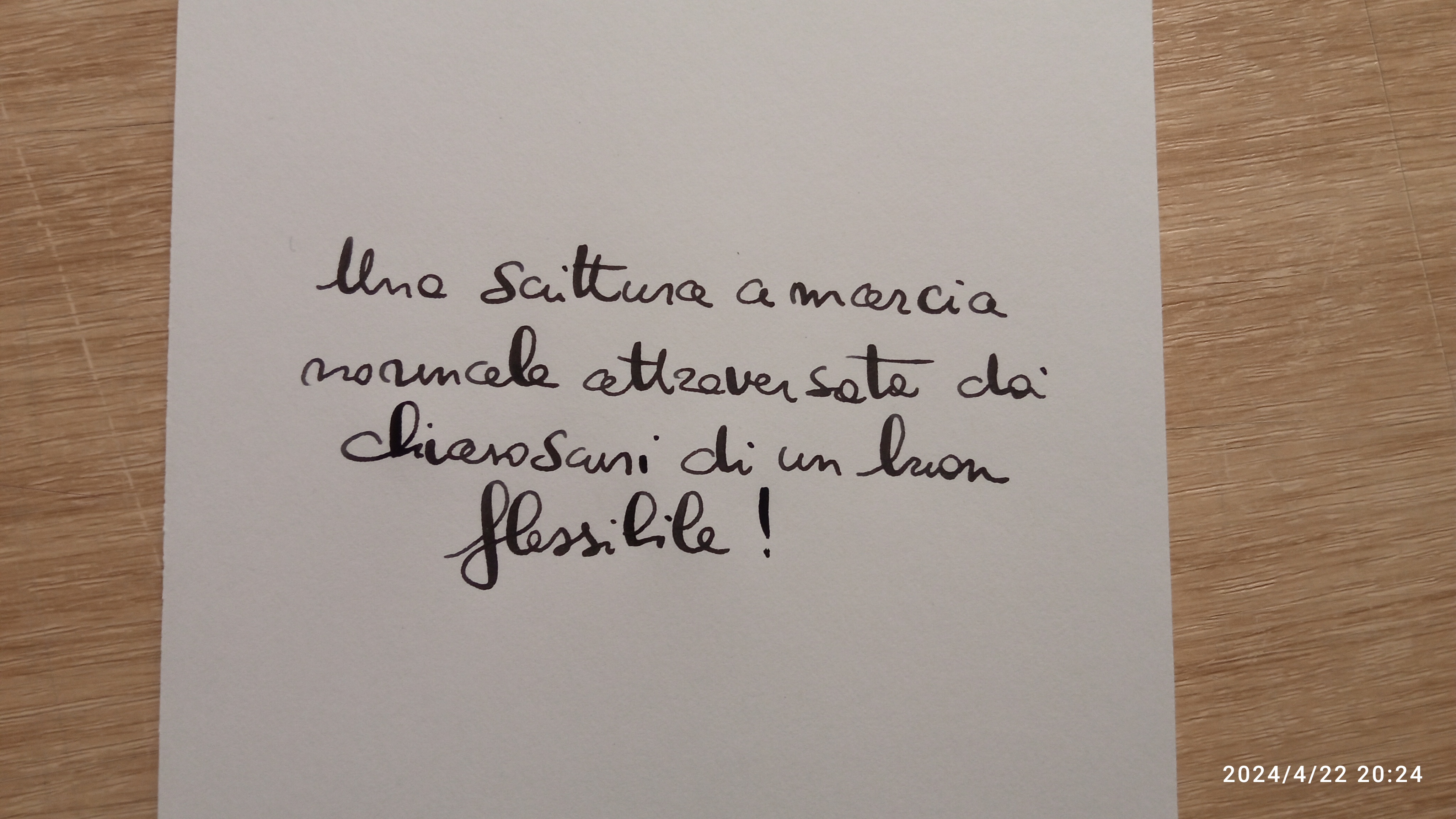 Ma infatti a essere sinceri a me non interessa la calligrafia. Per quel tipo di produzione artistica i pennini d'elezione sono quelli a inzuppo. A me interessa la grafia ordinaria praticata con il flessibile stilografico. Non parlo di un corsivo estremamente veloce. Una scrittura a marcia normale attraversata dai chiaroscuri di un buon flessibile.