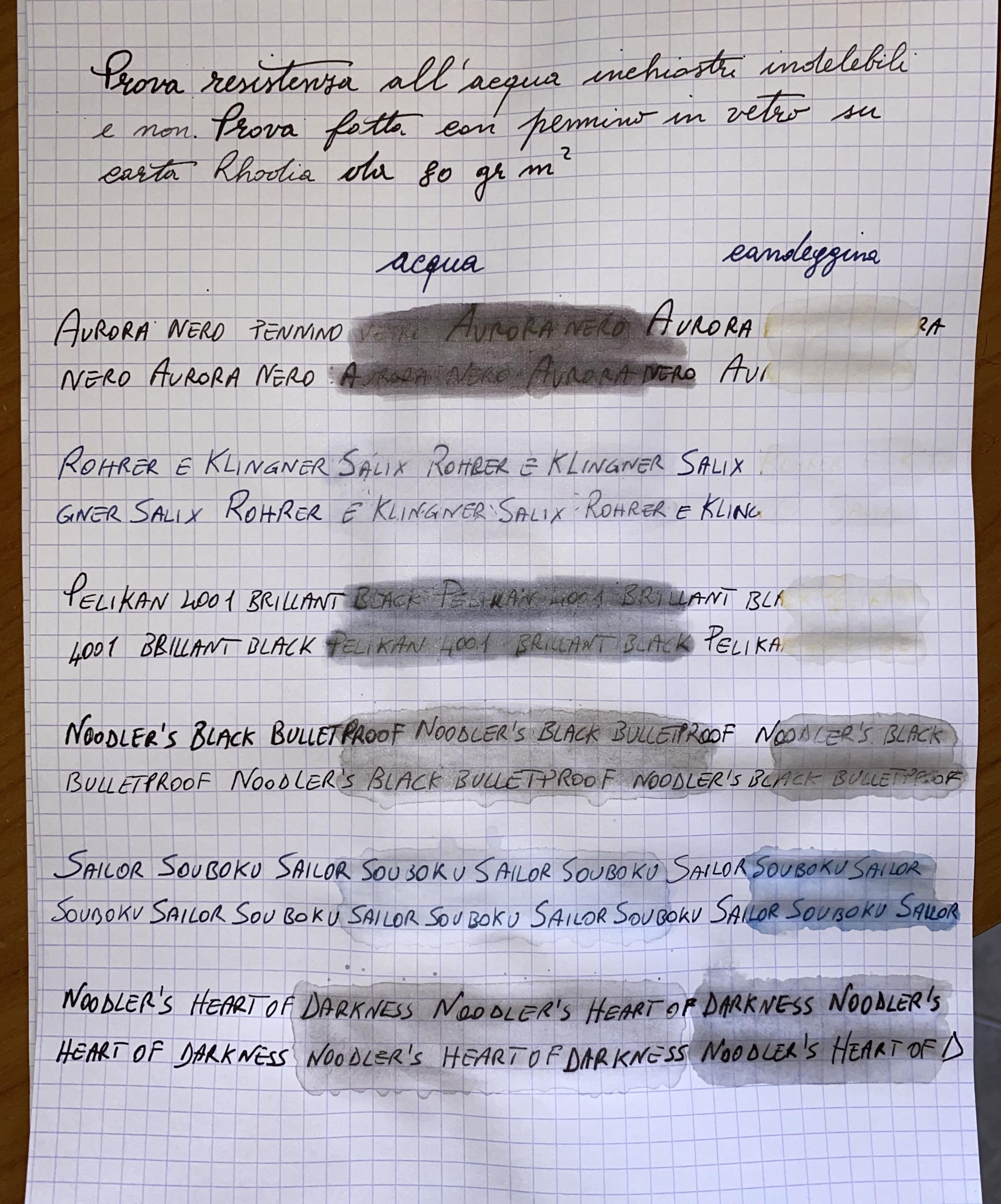 Ecco qui le mie prove; come per la resistenza alla luce non tutti sono inchiostri da stilografica (molti tra quelli che han retto meglio sono solo per pennino ad intinzione), e le chine Pelikan in fondo sono vecchie e potrebbero essere già danneggiate di loro.