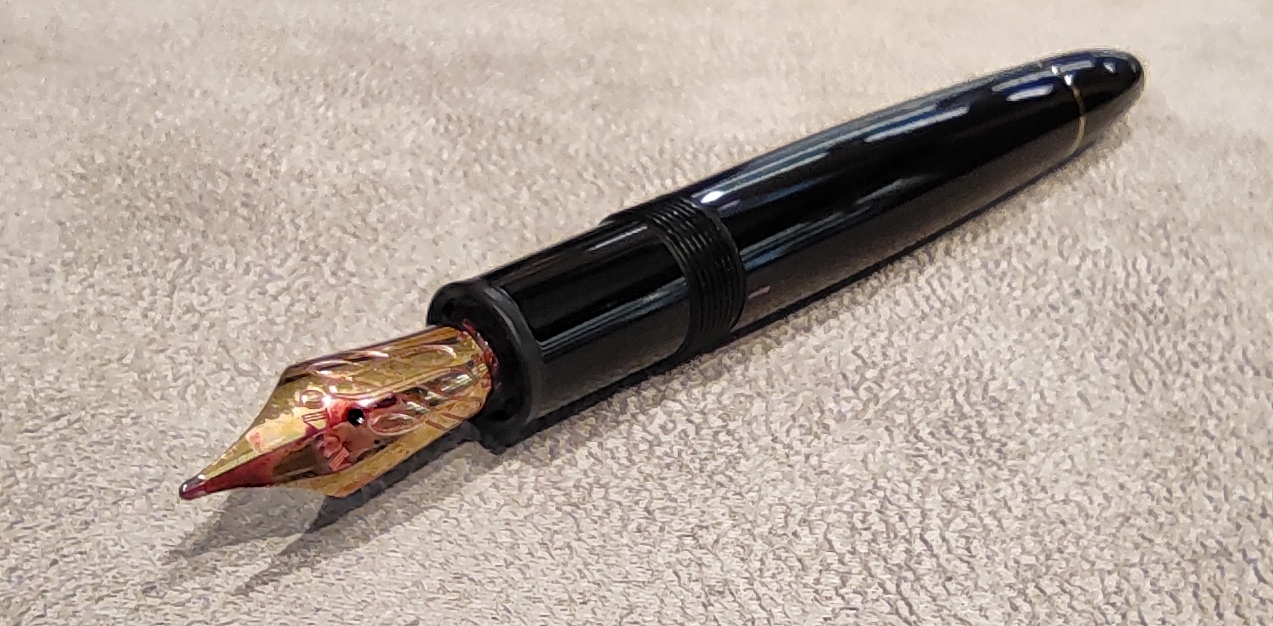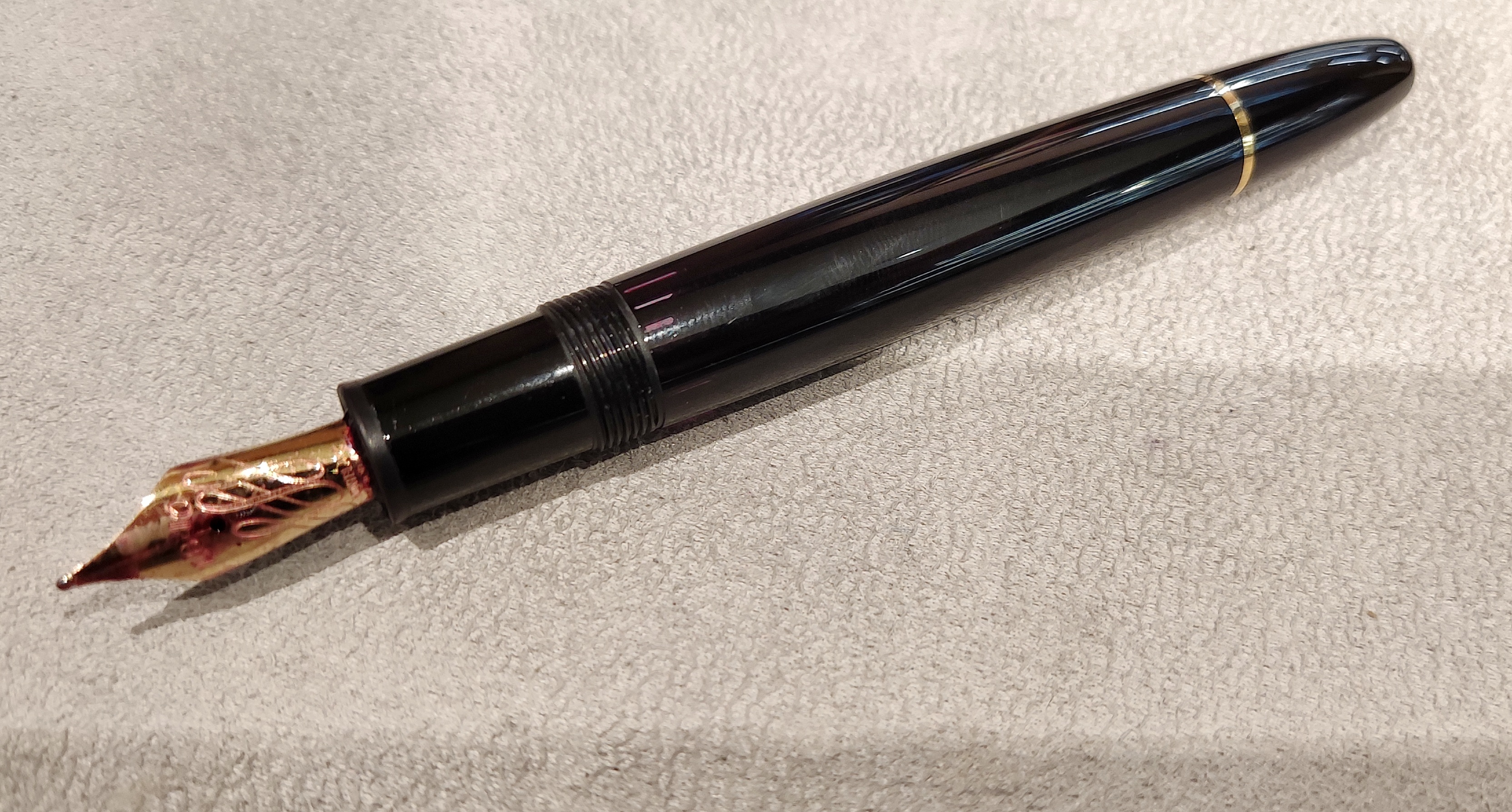 Confesso di essermi ritrovato spaesato perché non ero a conoscenza della sua esistenza. Una normalissima 146 nera e oro. Il pennino visibilmente più piccolo di quello della 149 riportava la stessa incisione del Flex della sorellina.