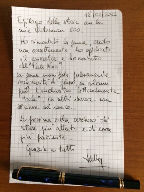 Credo che sia quest'ultimo caso, infatti ho smontato e rimontato tutto e sembra che adesso vada un po' meglio. "Sporchicchia" un pizzico all'attaccatura del pennino, ma sembrano più delle goccioline "schizzate" che altro.