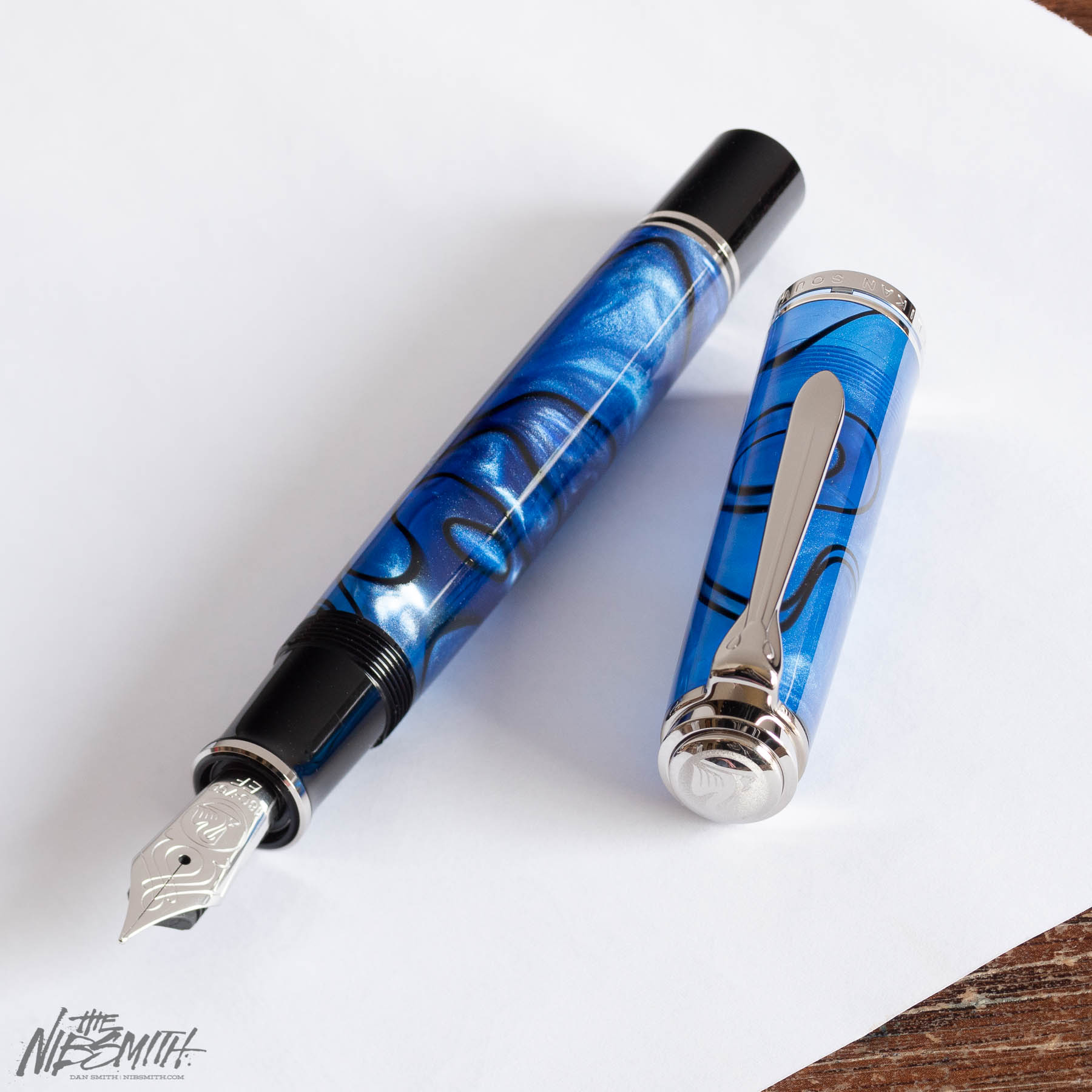 Solo il cappuccio è semitrasparente, e il colore è un blu con onde variegate di colore chiaro e scuro con tantissimi riflessi perlescenti, una figata assoluta. Aggiungo che il pennino è un EF stratosfericamente bello!
