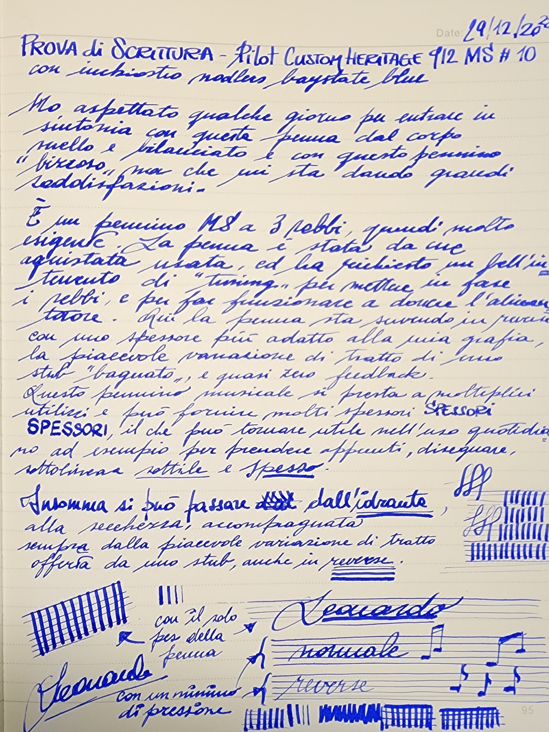 Avevo avuto anche io la sensazione che il pennino non fosse esattamente perfetto, ma vedendo che Pilot consiglia di usarlo in verticale (e in verticale funzionava benone) mi sono detto che non faceva per me.