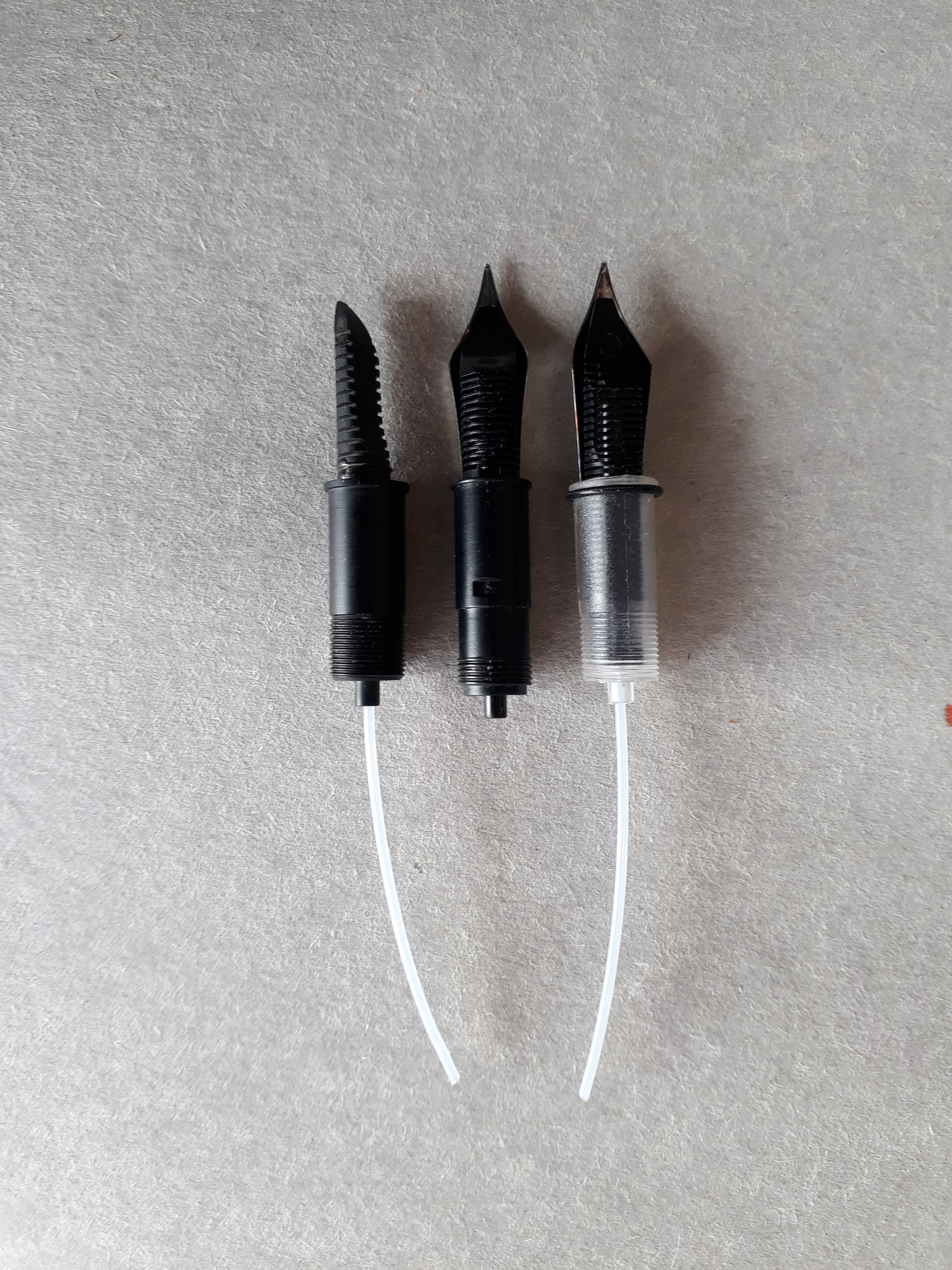 Posto due foto: In una si vedono i tre collarini assemblati. Il primo a sinistra, è l'originale Duchessa in ebanite. Sostituito perchè si sfilava il pennino (che poi si è arrugginito) con l'alimentatore e risultavano laschi. Quello in centro, più lungo, è il Kaweco. Il terzo è il collarino originale in plastica che mi hanno mandato l'ultima volta, con il pennino errato ma con alimentatore e collarino incollati assieme, che anche volendo , non si sfilano.