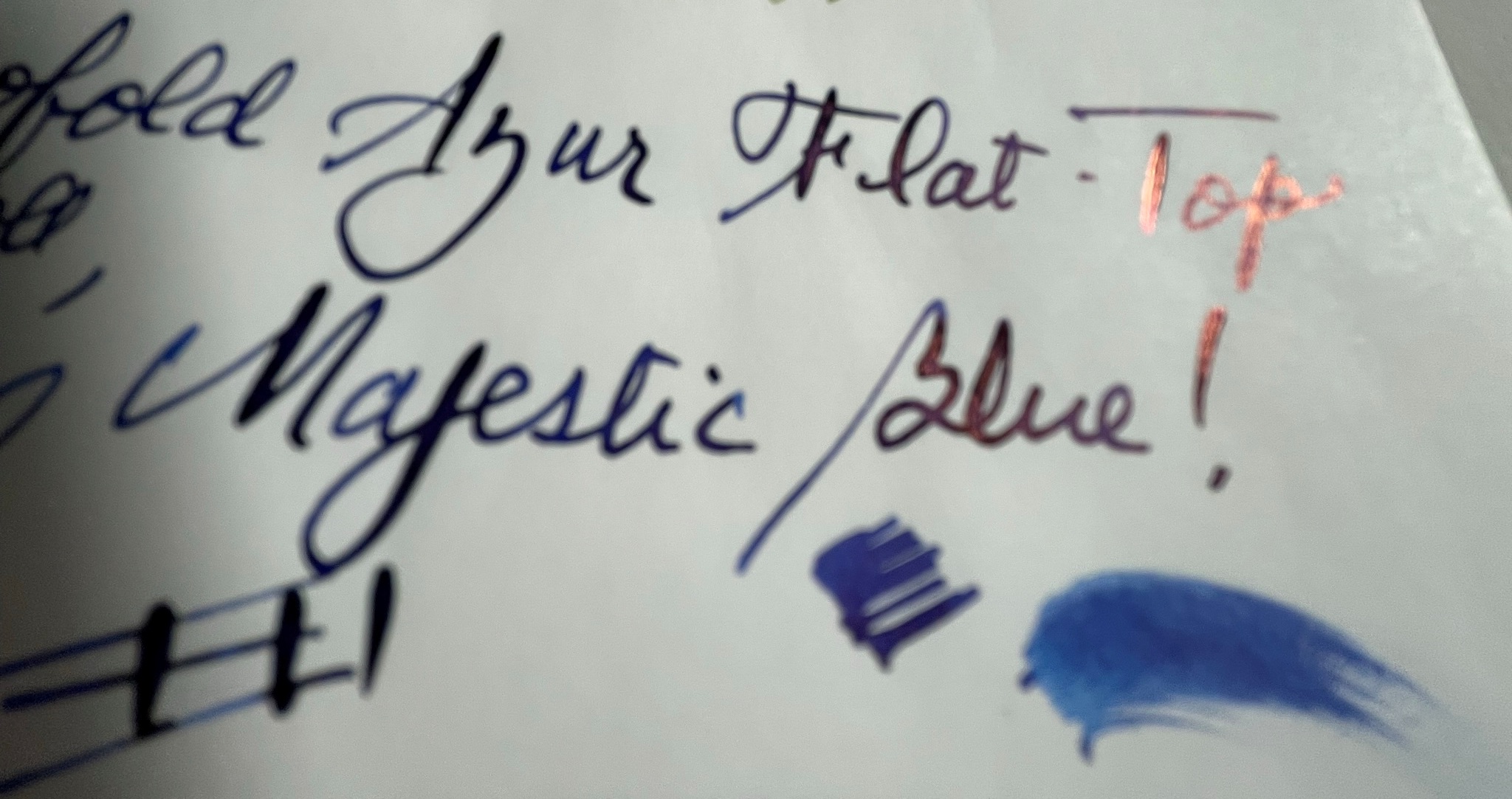 il Majestic Blue è uno dei miei preferiti, funziona benissimo con i pennini a rebbi molto stretti che non lascian passare niente ed è molto untuoso. Colla mia boccetta non noto tendenze verdi, anzi, blu molto dichiarato.