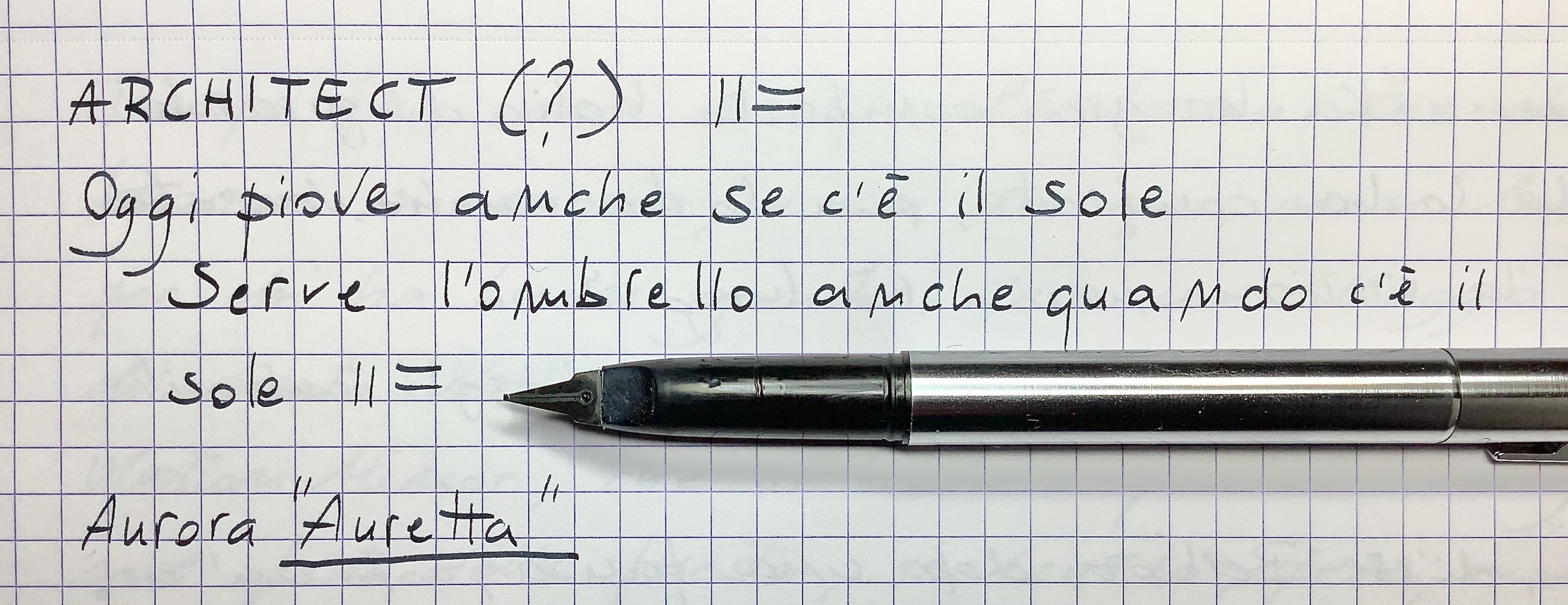 Tuttavia può essere utile sapere che è possibile ottenere la tipologia di scrittura dell'architect pur non avendone uno. A me ogni tanto piace vedere questa variazione di tratti verticali fini e orizzontali spessi, ma non avendo appunto un pennino tagliato per questa scrittura, mi accontento di un pennino italico, che tenuto ruotato scrive come un architect; l'impugnatura è scorretta? Formalmente si (forse no...). Mi è comodo scrivere in questo modo? Sì, e allora va bene così.