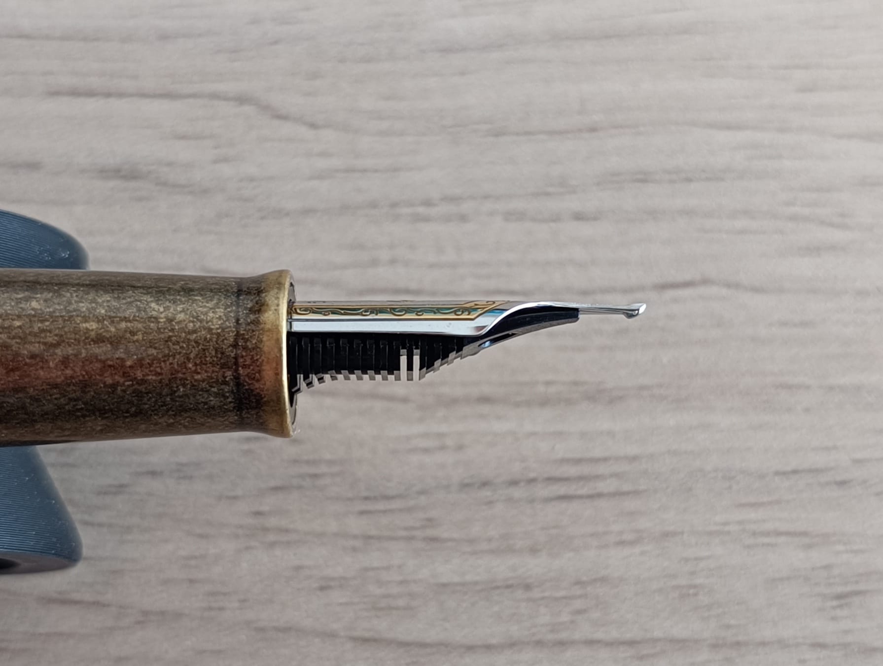 Se si guarda la forma della lama, soprattutto verso la punta, quella è la forma da cui trasse ispirazione il compianto maestro Nagahara Senior per la creazione di questa tipologia di pennino.
