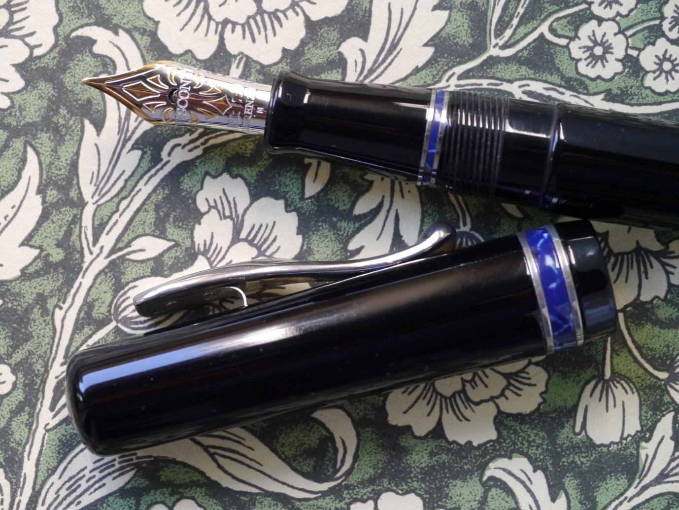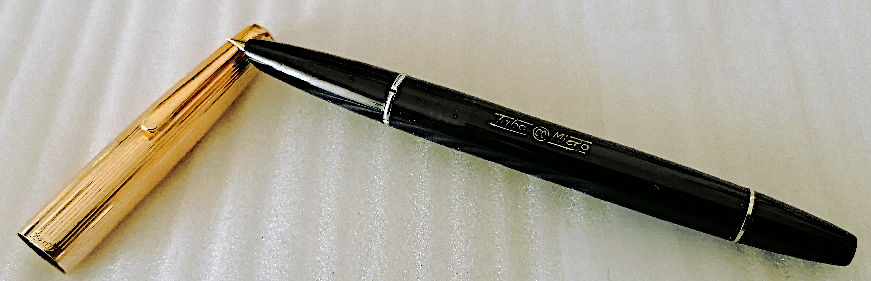 Penna a pistone che misura chiusa 11.5 cm e aperta 10.9 cm. Buona trasparenza della finestra dell'inchiostro e ottime condizioni generali (ho giusto rifatto la guarnizione in sughero) con celluloide nera ancora splendente e dorature di cappuccio e veretta del fondello lucidate e tornate come nuove.