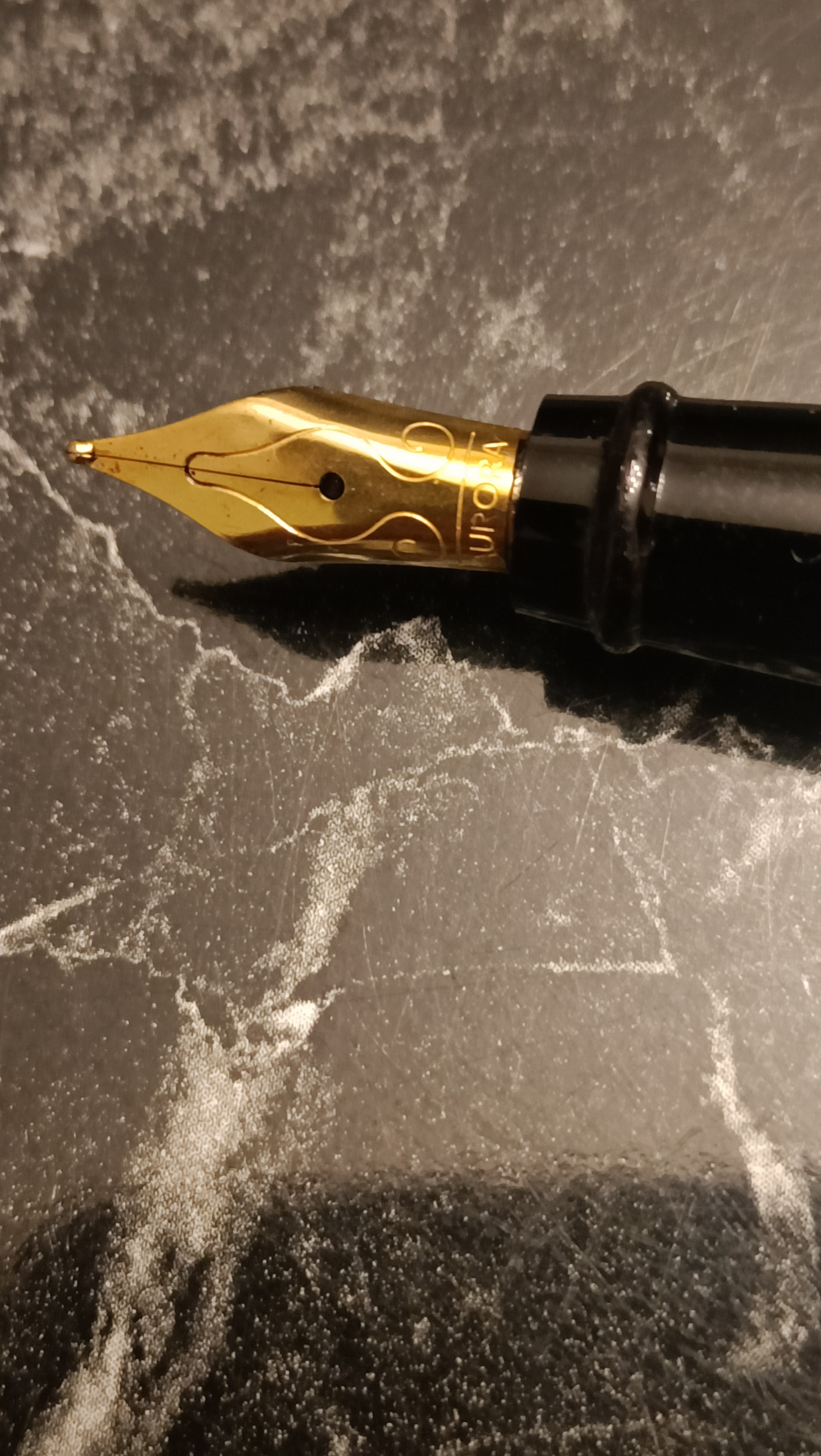 Non vedo indicazioni di caratura sul pennino, nè smaltature sul fermaglio. Continuo a preferire pennini <F>. Spero di riuscire a trovarlo da qualche parte.