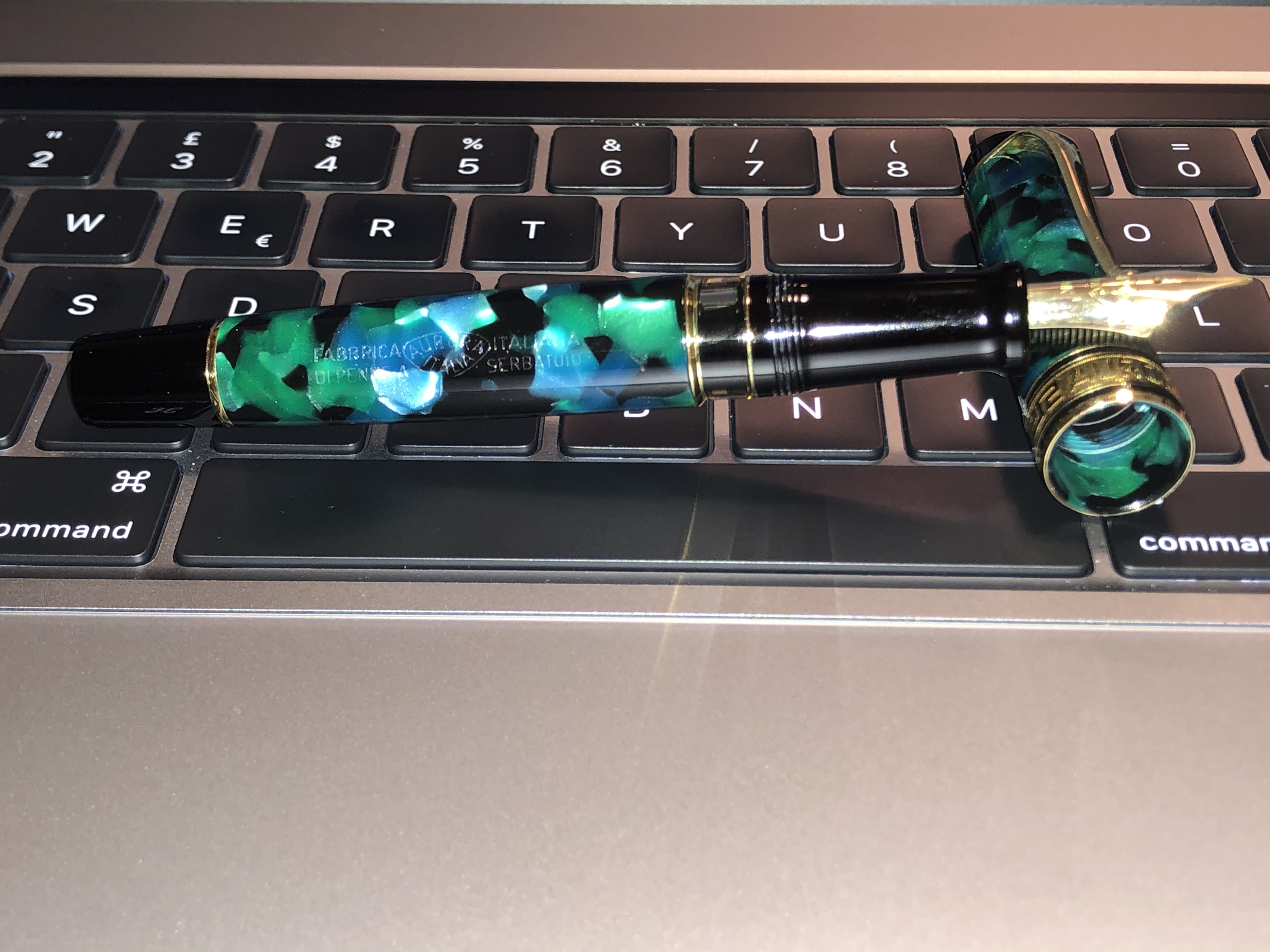 Una Aurora Optima Verde tratto F(per i miei gusti praticamente perfetto), tornata da poco dalle amorevoli cure di Mamma Aurora. Aveva un trafilamento di inchiostro tra la finestrella di controllo e il fusto. Tutto risolto con una spesa congrua ed una tempistica ragionevole.