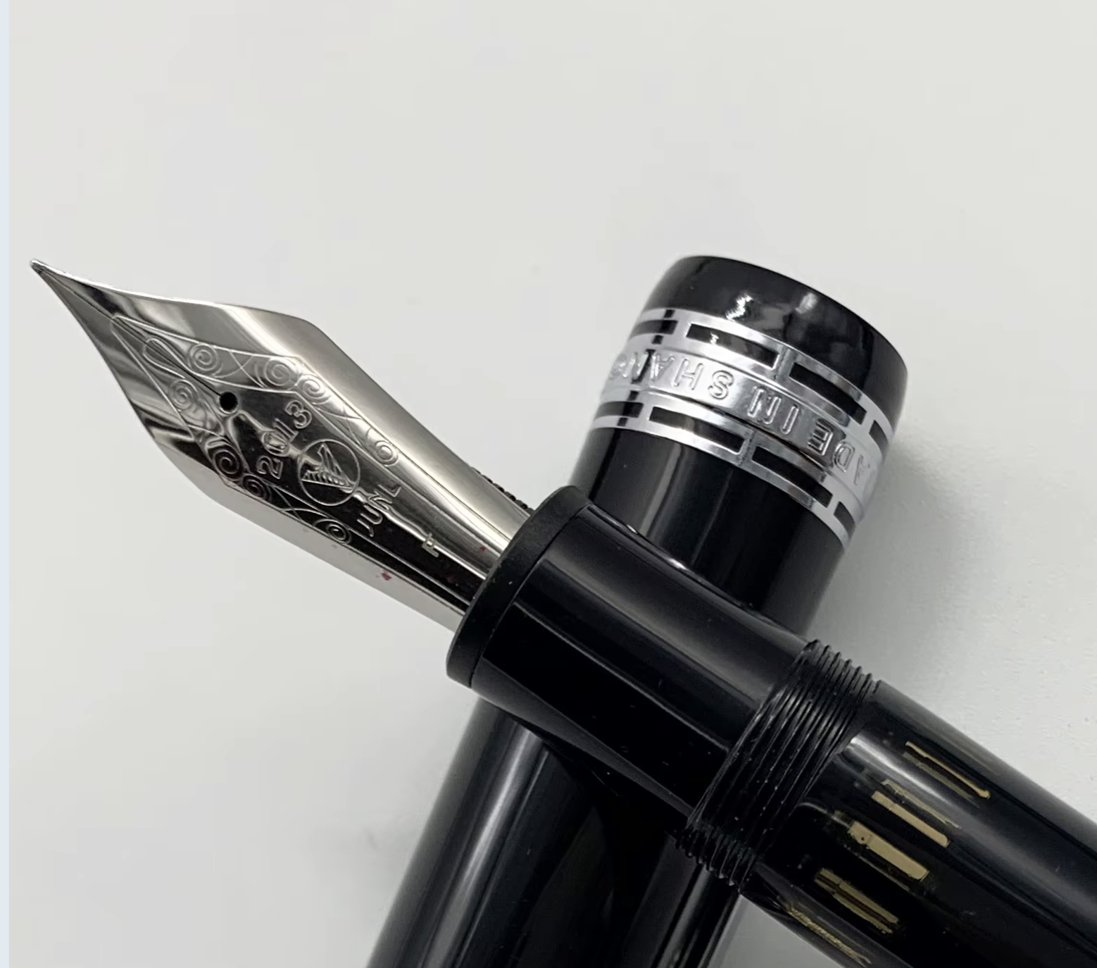 Praticamente la stilografica Muji in versione Hongdian (che molti pensano essere la fabbrica anche dell'originale Muji...), con pennino dal decoro dedicato a questo modello.