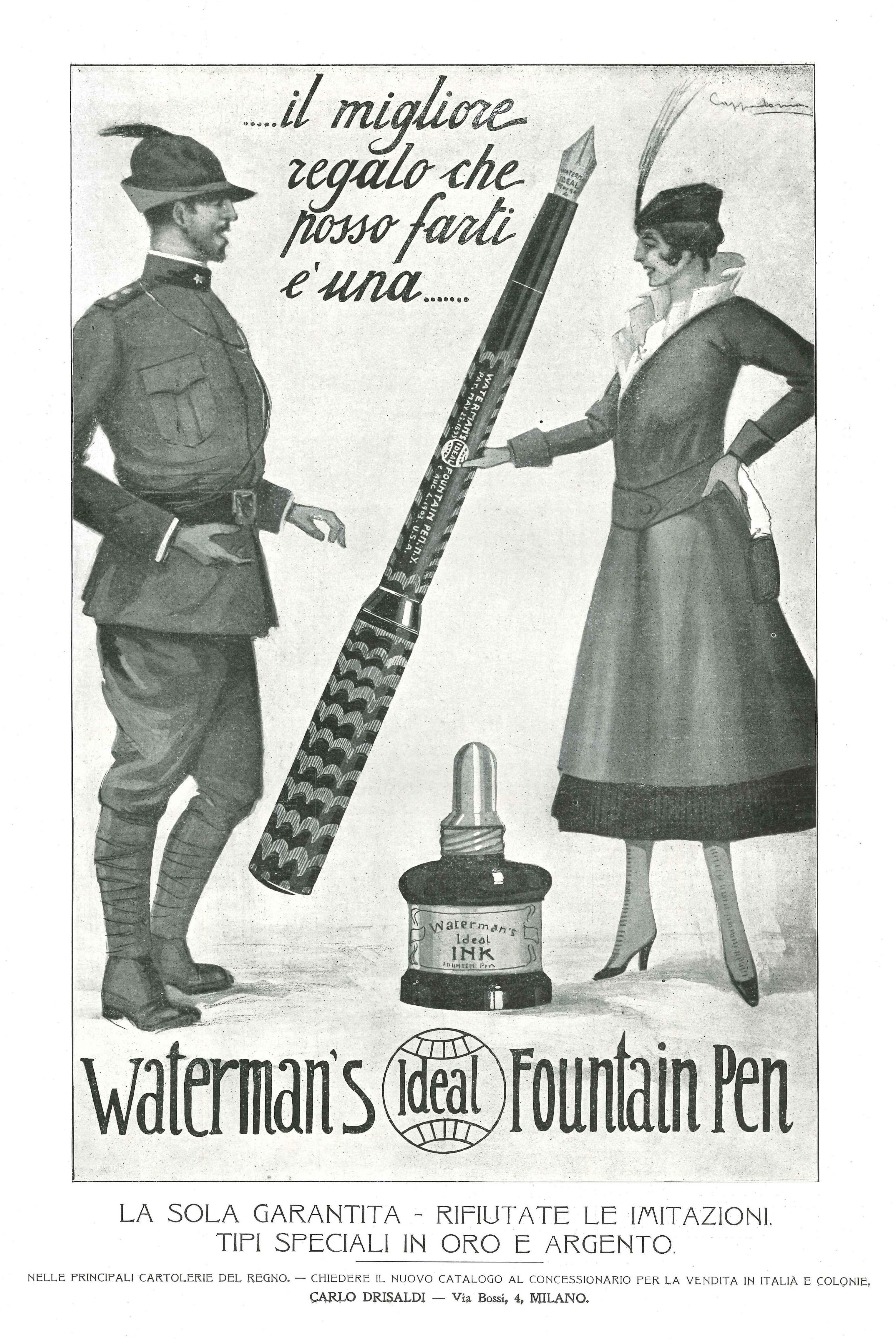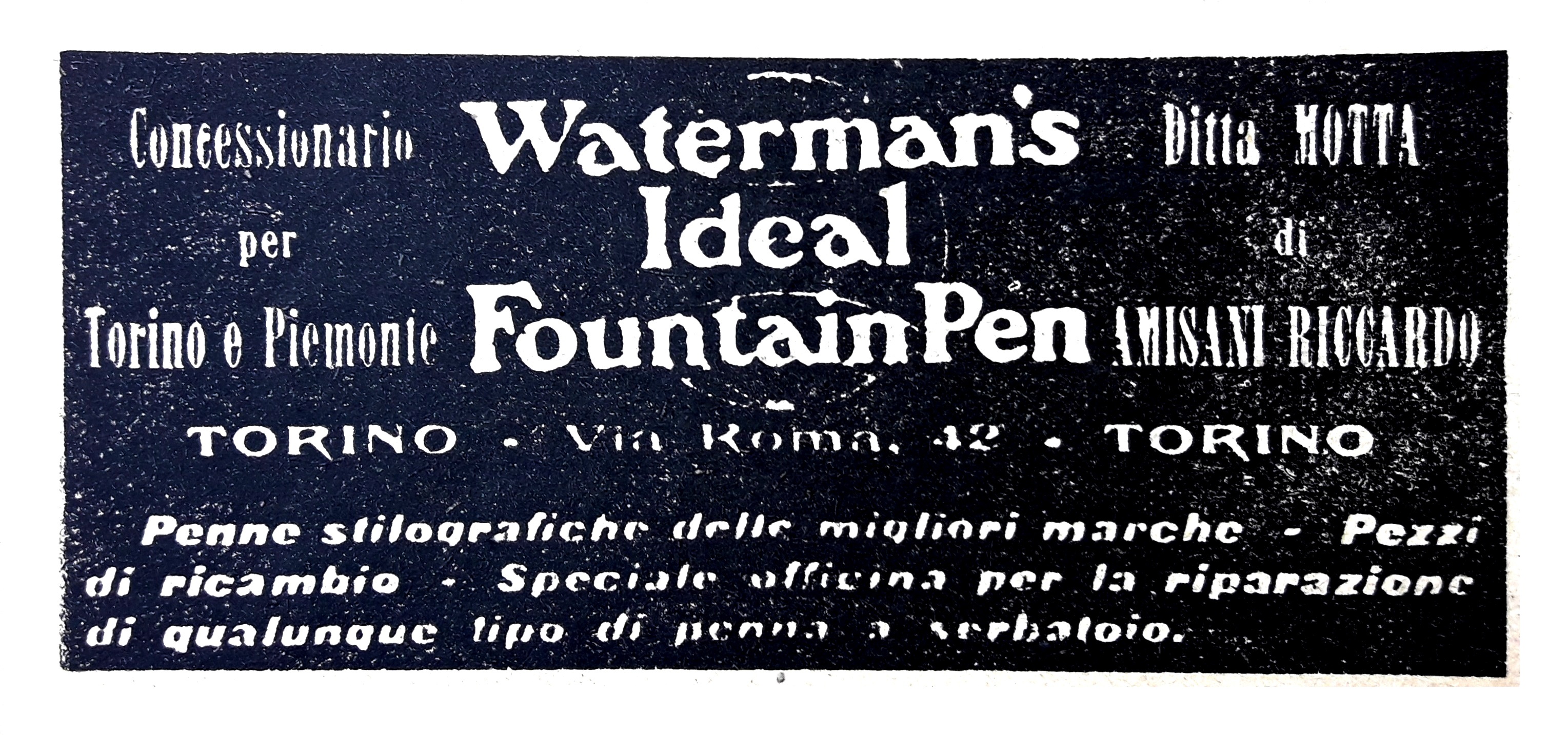 Da queste due pubblicità apprendiamo che, dopo il passaggio della titolarità del Deposito Generale per l'Italia e della esclusività della Concessione per la vendita all'ingrosso di Waterman dalla Ditta Hardtmuth al Cav. Drisaldi (avvenuto per lo scoppio della I Guerra Mondiale nel 1914), ancora a cavallo tra il 1915 ed il 1916 (comunque in piena Guerra anche per l'Italia ormai) Waterman si serviva (anche) del Concessionario Riccardo Amisani (che dai primi del Novecento - ca. 1906 - rappresentava l'americana Williamson), almeno per la vendita a Torino e Piemonte…