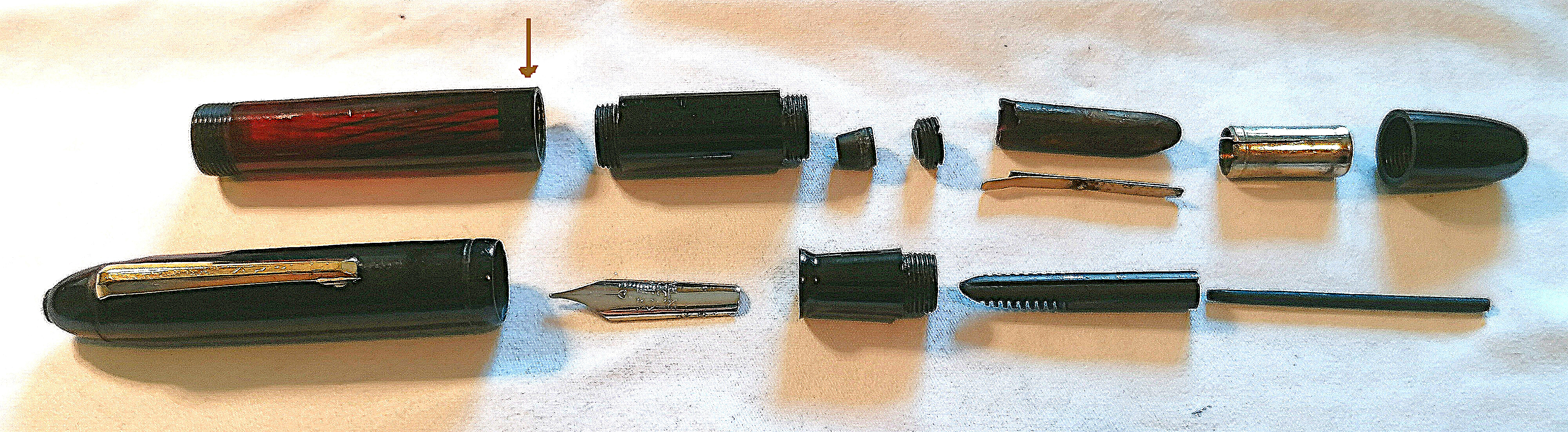 Nella foto esplosa la freccia indica solamente una piccola fissurazione del fusto/serbatoio riparata con un filo di cianoacrilato, le altre due sono la penna completa e la parte del sistema di caricamento coperto dal fondello.